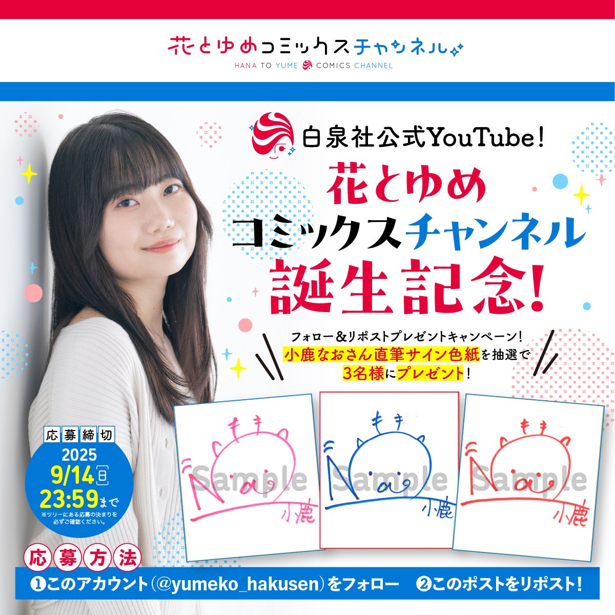 『花とゆめコミックスチャンネル/HANA TO YUME COMICS【公式】』の誕生を記念して、白泉社の少女まんが公式X『ゆめ子@花とゆめコミックス【公式】(@yumeko_hakusen)』で小鹿なおさんの直筆サイン入り色紙を抽選で3名様にプレゼント!