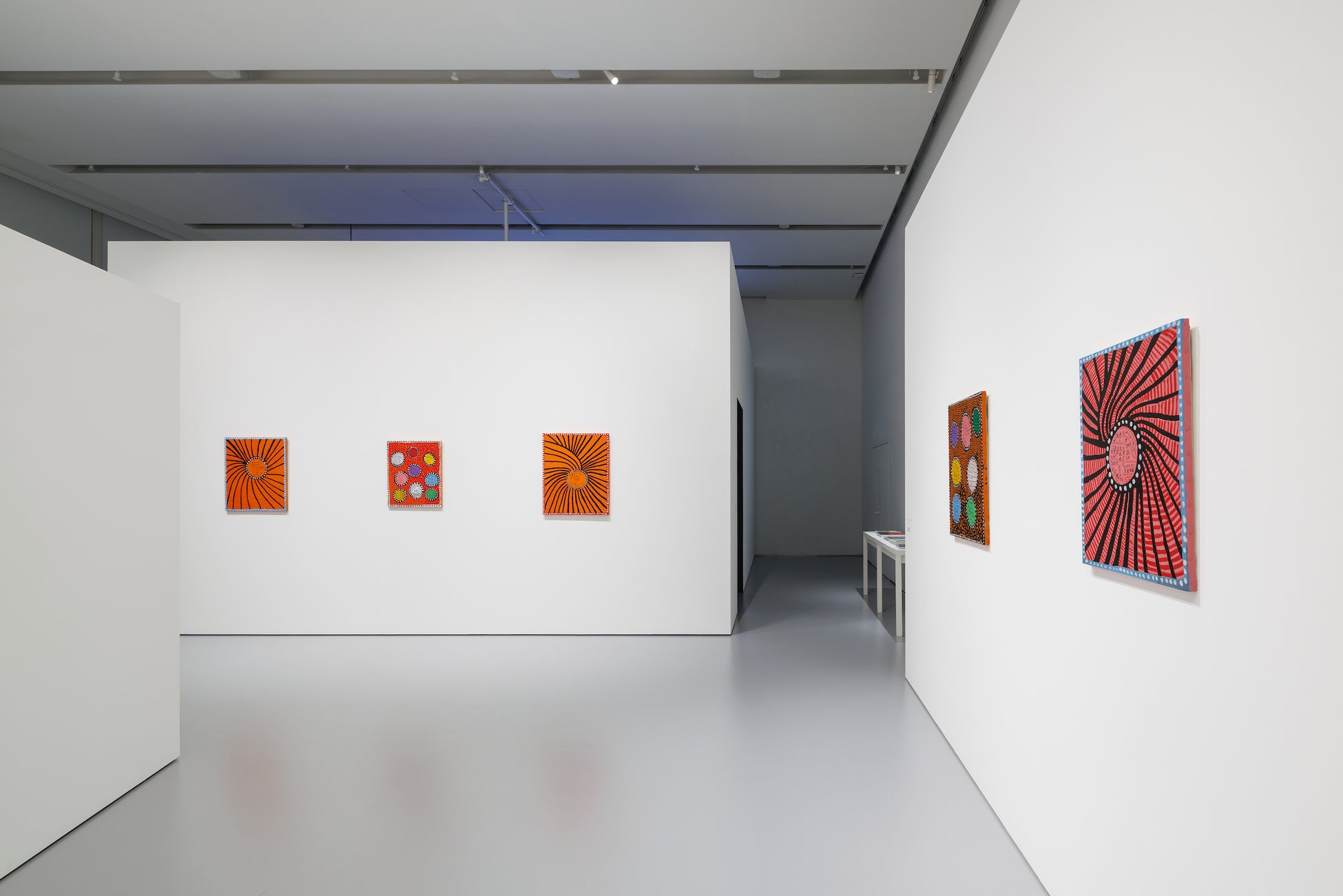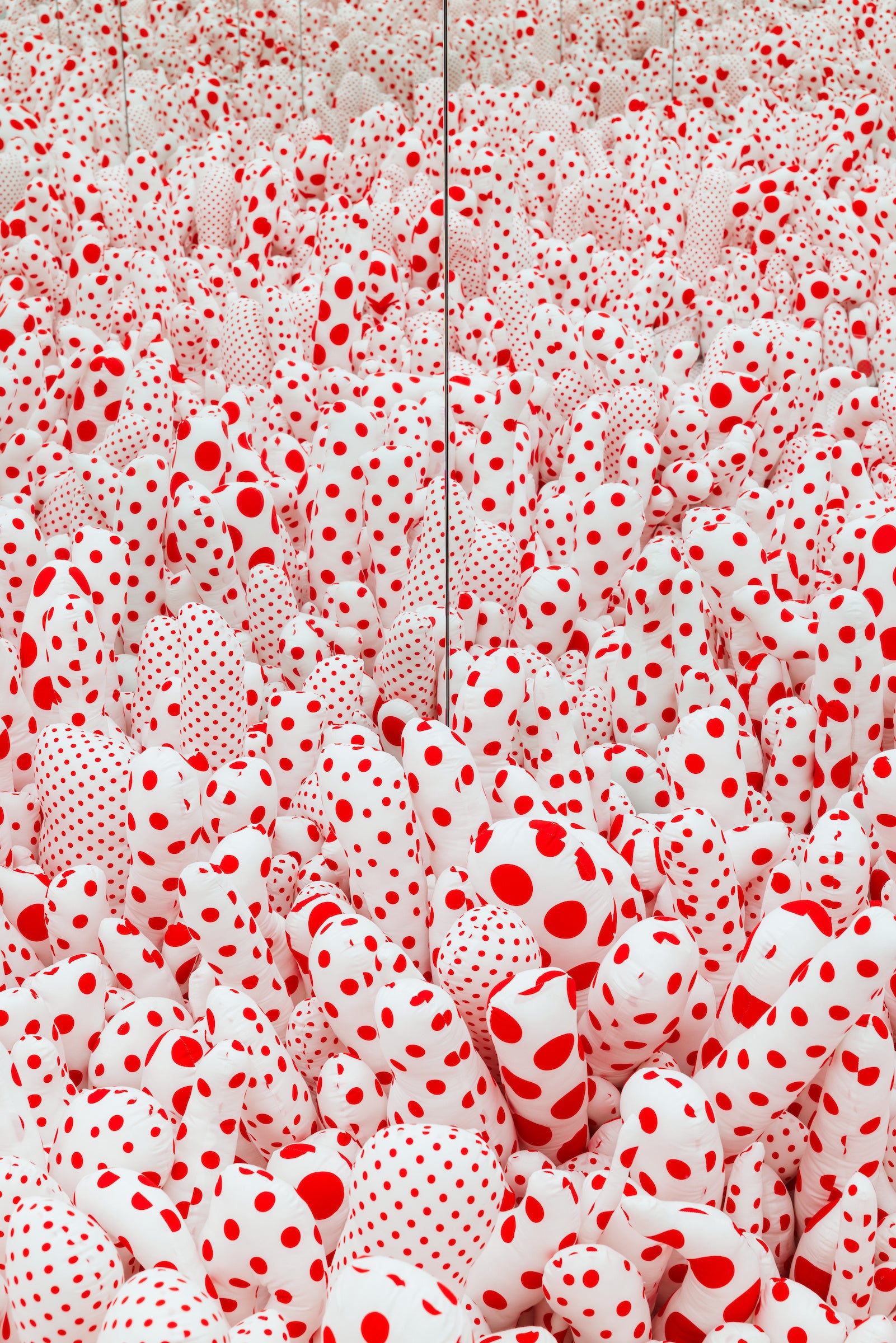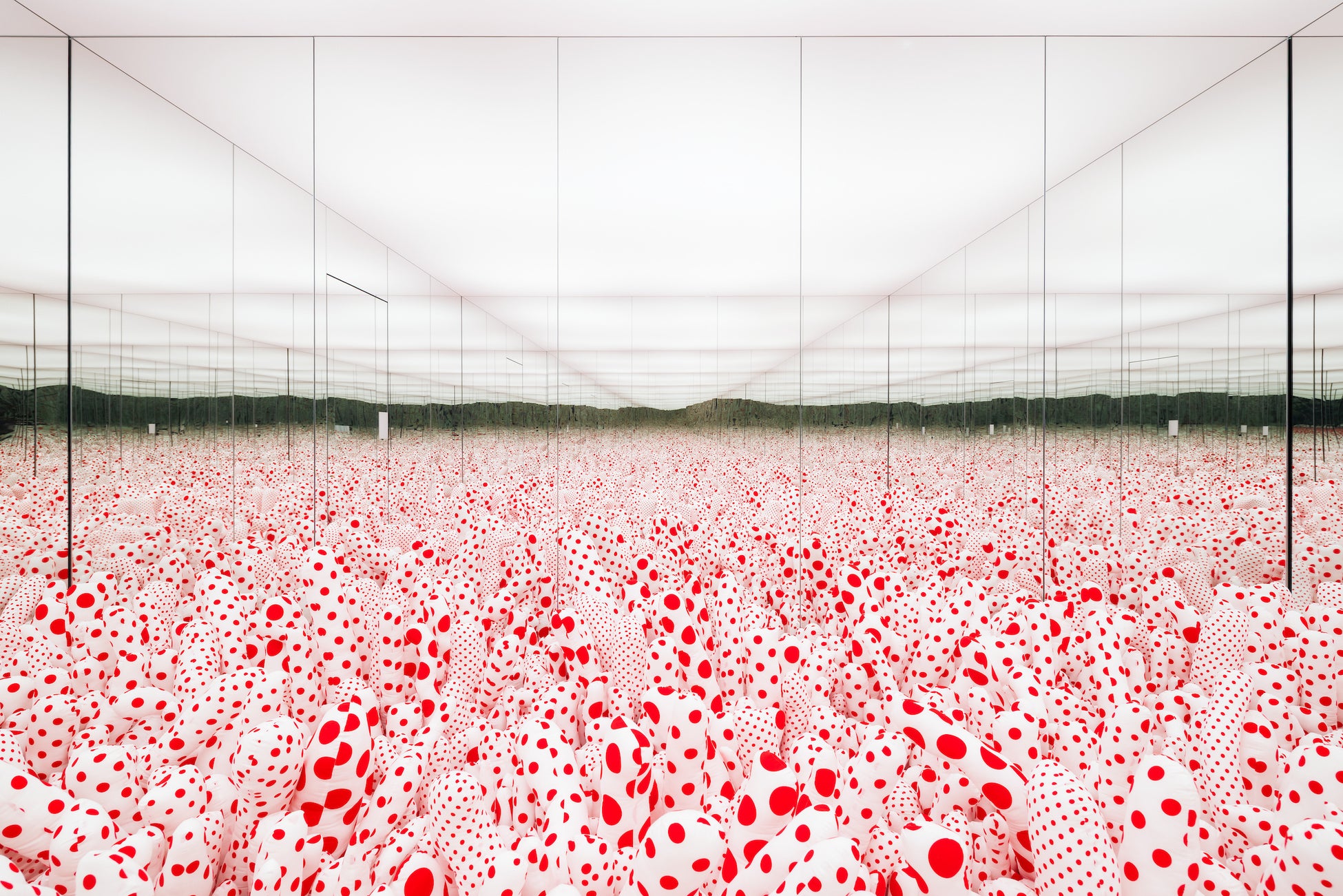 これらのモチーフに込められているのは、草間の根底にある哲学です。展覧会のハイライトとなる《無限の鏡の間―ファルスの原野(または フロアーショー)》(1965年 / 2013年)は、彼女が手掛けた数多くの「無限の鏡の間」の第1作であり、来場者を果てしなく続く水玉の世界へと誘い、方向感覚を失うほどの没入体験をもたらします。この象徴的な作品では、《毎日愛について祈っている》(2023年)に込められた詩的な想いや反復的な絵画制作と同じように、幻覚的なビジョンと宇宙における個人の居場所についての哲学を表現しています。草間は「水玉」と「無限の網」による多様な技法を駆使しながら、鑑賞者に無限について考えるよう促し、彼女が「自己消滅」と呼ぶ過程において視覚的な没入へと誘います。こうして彼女は、自我を手放して自分たちを包み込む空間と1つになるよう私たちを導いているのです。