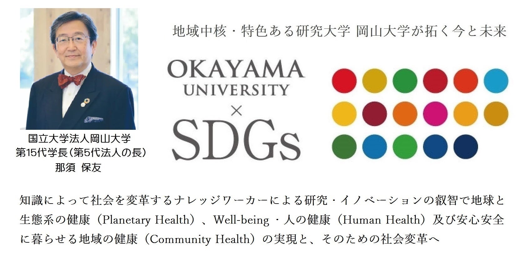 国立大学法人岡山大学は、国連の「持続可能な開発目標(SDGs)」を支援しています。また、政府の第1回「ジャパンSDGsアワード」特別賞を受賞しています。地域中核・特色ある研究大学として共育共創を進める岡山大学にご期待ください