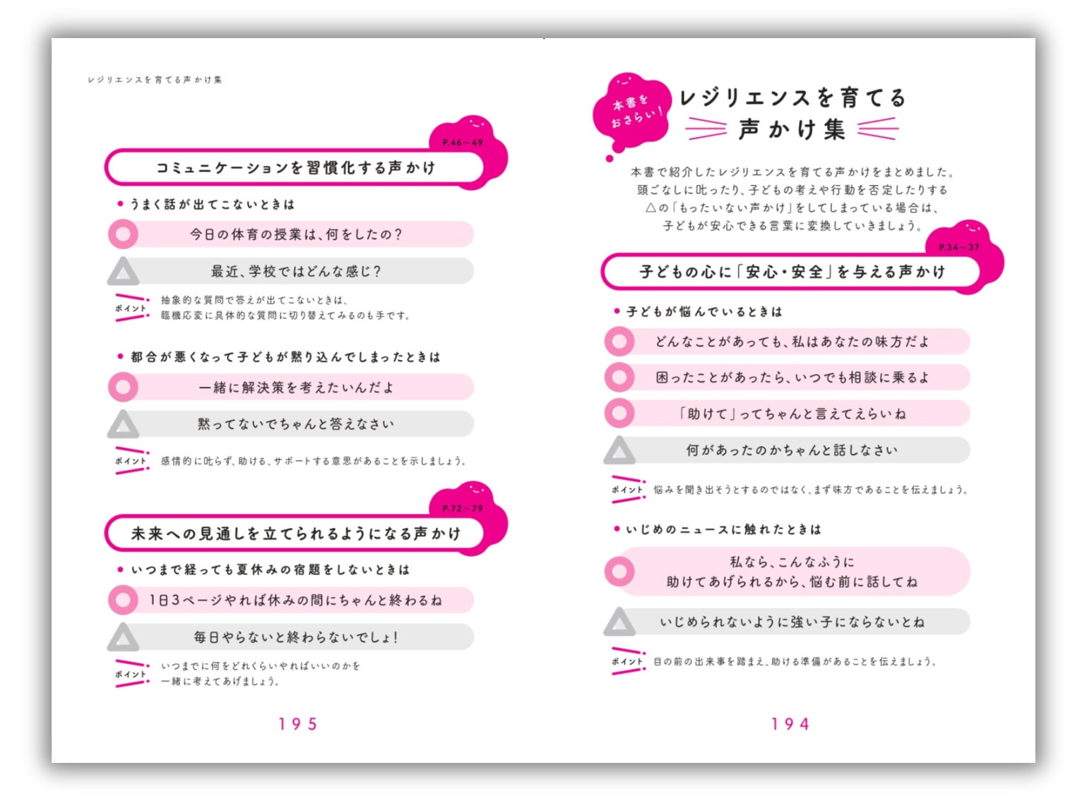 親子の対話は、限られた時間であってもどのようなことを話すかで差が出ます。本書では対話例、ふだんの声かけ集など具体的な提案を掲載しているのですぐに実践することができます。さらに、楽しみながら簡単にできるワークによって子ども自身が「自分の武器」を発見。「わかる!」「できる!」「やろう!」という意欲につながります。