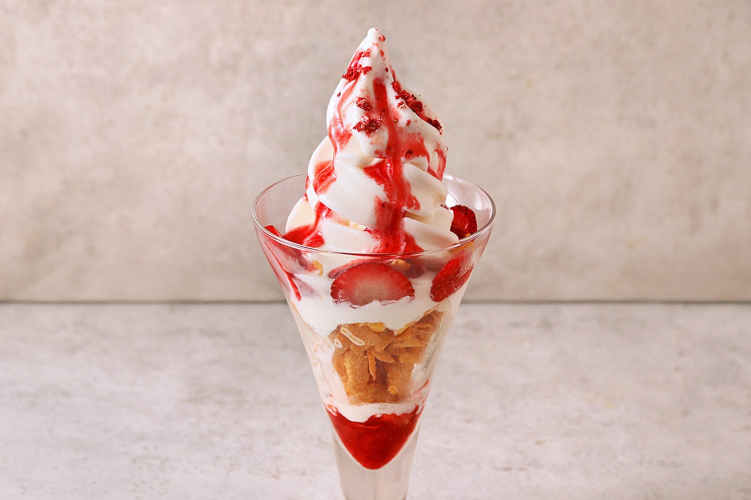 濃厚なソフトクリームにまろやかな酸味のヨーグルトと甘酸っぱいストロベリーソースをかけたサンデー。上と下で苺のソースが異なるので色んなストロベリーの風味をお愉しみください。