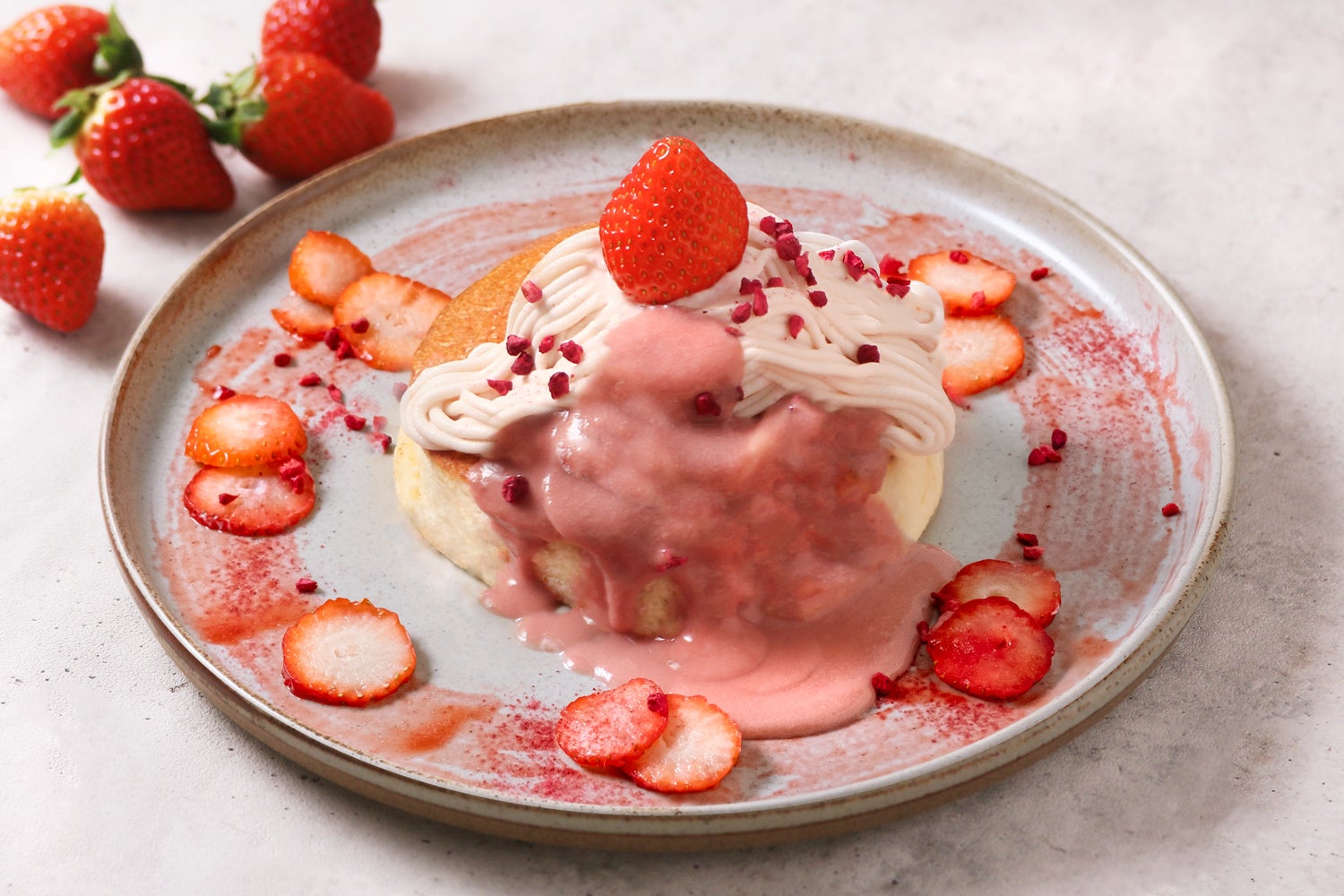焼きたてのパンケーキの上にはストロベリーアイスと、爽やかで甘酸っぱいいちご風味のチーズクリームをたっぷりモンブラン仕立てに。ホワイトチョコにストロベリーを合わせた甘くミルキーなソースを添えて、さらにいちごを散らした、いちごづくしのパンケーキ。