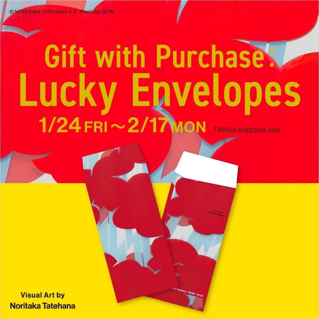 期間中、各店免税カウンターをご利用いただいたお客さまに先着で「現代美術家 舘鼻則孝×西武・そごうオリジナルデザインポチ袋」(5枚/1セット)をプレゼントいたします。福をお裾分けする「紅包」という中華圏の風習を参考に、日本での思い出を入れるギフト用袋をイメージして作製しました。
