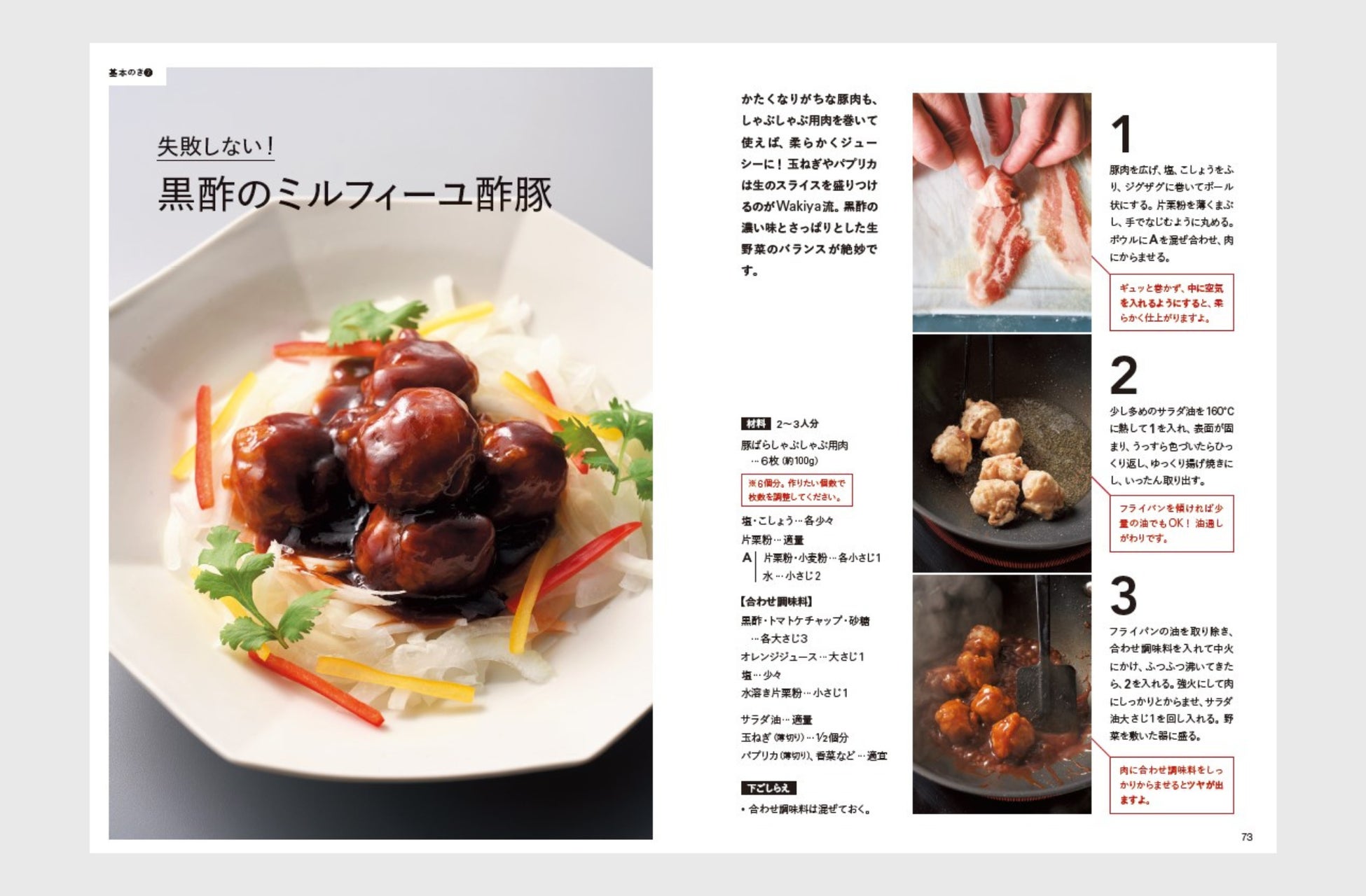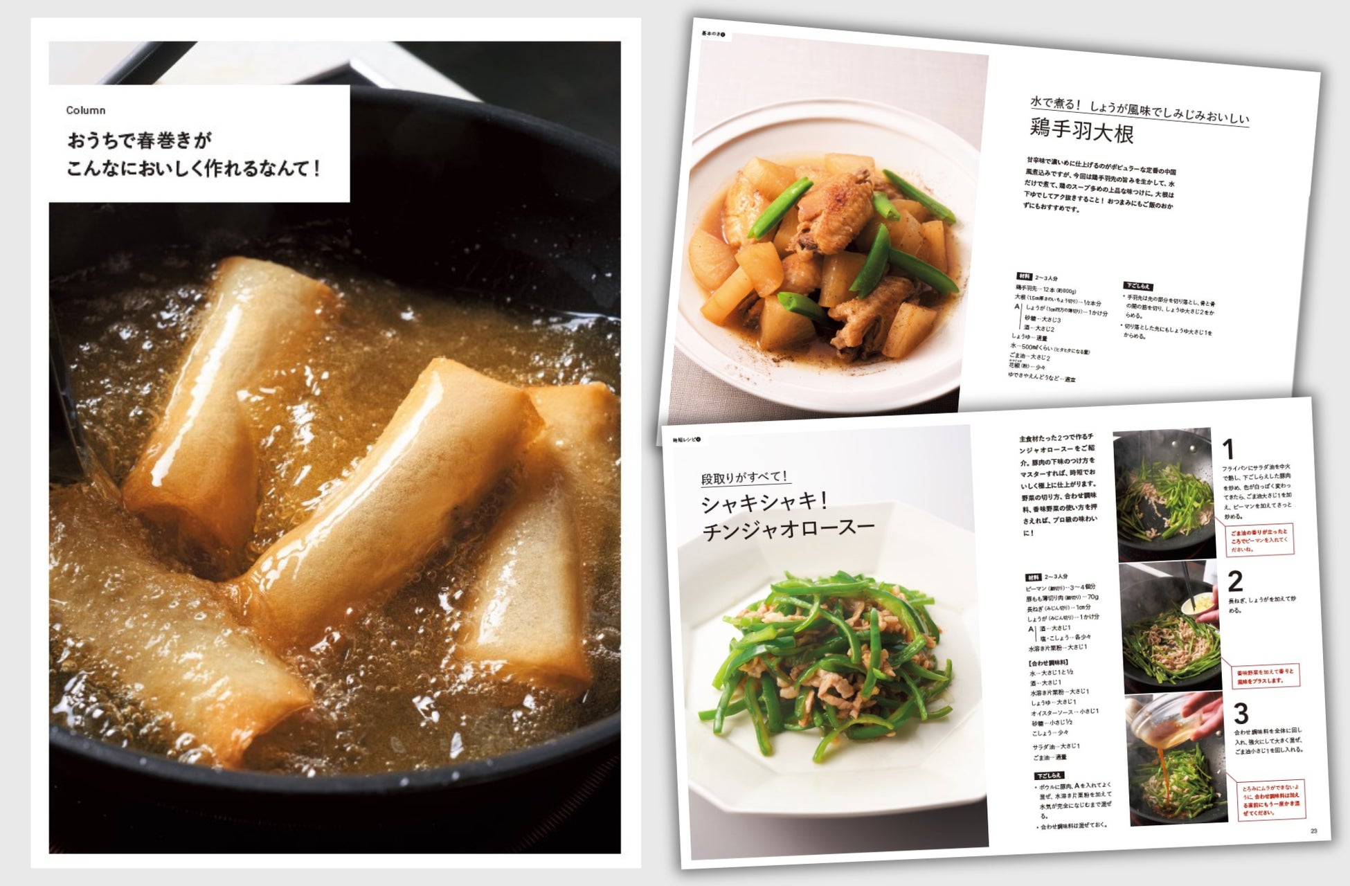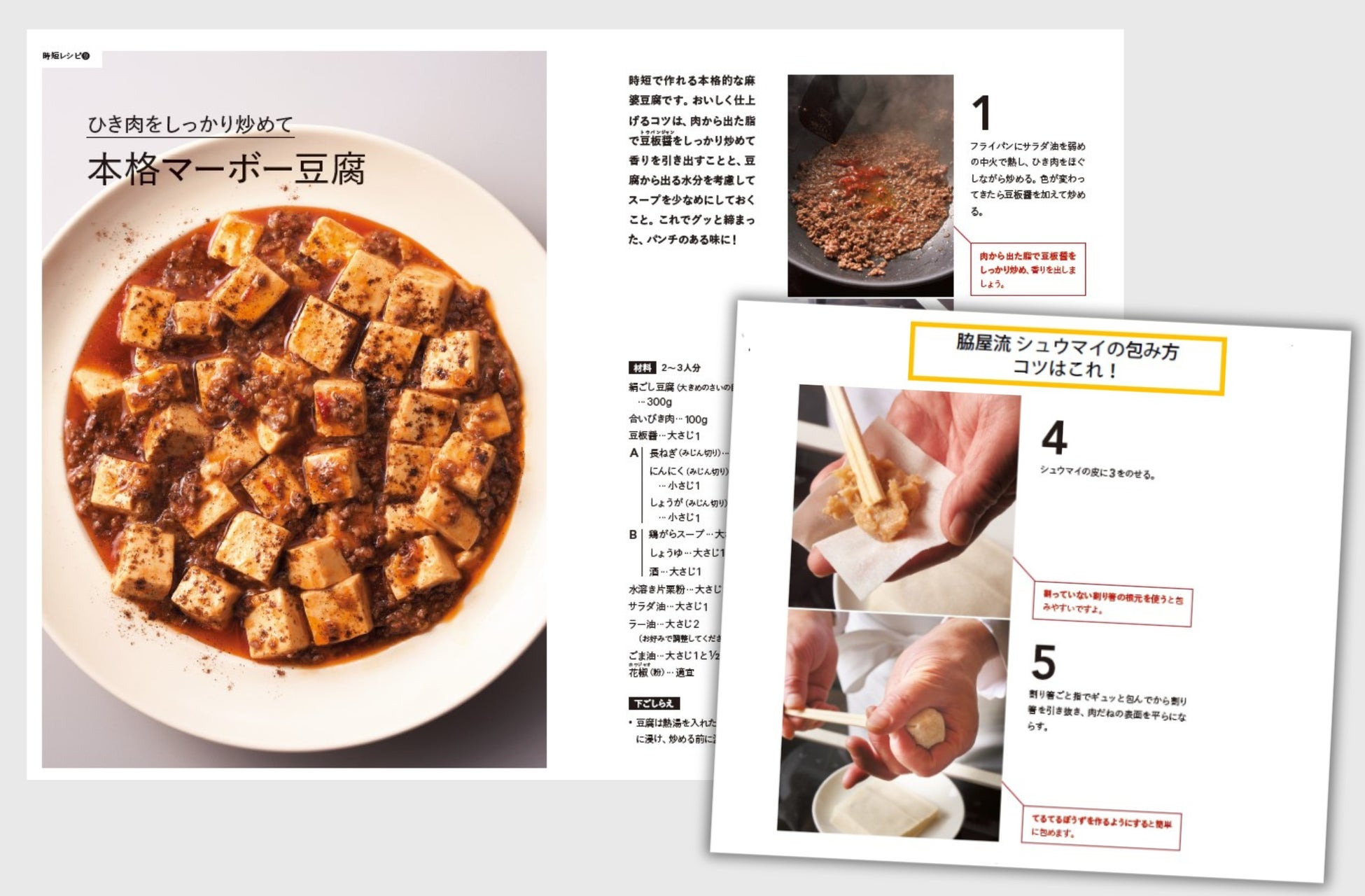 この本では作り方にプロセス写真を多用し、それぞれに脇屋シェフからのコメント付きだから、まるで動画を見ているかのようによく分かるのが特徴です。「中華って、火力が強くないとおいしく作れないよね」「中華鍋は必要なの?」と思われがちですが、ほとんどの料理で家庭用の深型フライパンを使い、加熱調理もIHコンロで行っているのでご家庭での再現性もバッチリ。脇屋シェフのおいしさ保証付きですよ!