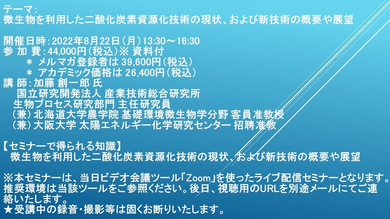 先端技術情報や市場情報を提供している(株)シーエムシー・リサーチ(千代田区神田錦町: https://cmcre.com/ )では、 各種材料・化学品などの市場動向・技術動向のセミナーや書籍発行を行っておりますが、 このたび「微生物を利用した二酸化炭素資源化技術の現状、および新技術の概要や展望」と題するセミナーを、 講師に加藤 創一郎 氏 国立研究開発法人 産業技術総合研究所 生物プロセス研究部門 主任研究員 (兼) 北海道大学農学院 基礎環境微生物学分野 客員准教授 (兼) 大阪大学 太陽エネルギー化学研究センター 招聘准教)をお迎えし、2022年8月22日(月)13:30より、 ZOOMを利用したライブ配信で開催いたします。 受講料は、 一般:44,000円(税込)、 弊社メルマガ会員:39,600円(税込)、 アカデミック価格は26,400円(税込)となっております(資料付)。