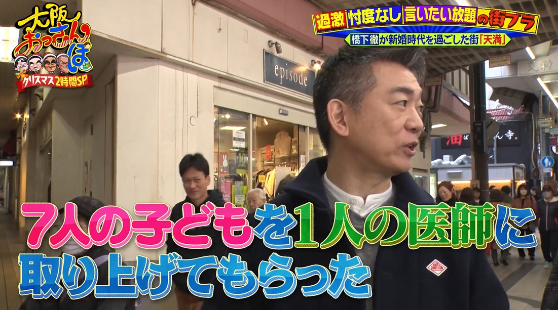 引き続き、商店街を散策していると、橋下が弁護士になりたての頃に初めて奥様と同棲した天六界隈に突入。こちらのエリアには、7人の子どもが生まれた産婦人科も存在するという。