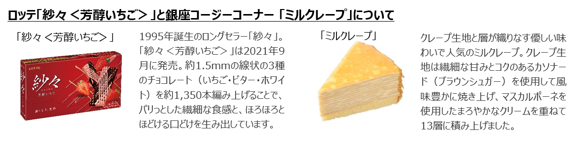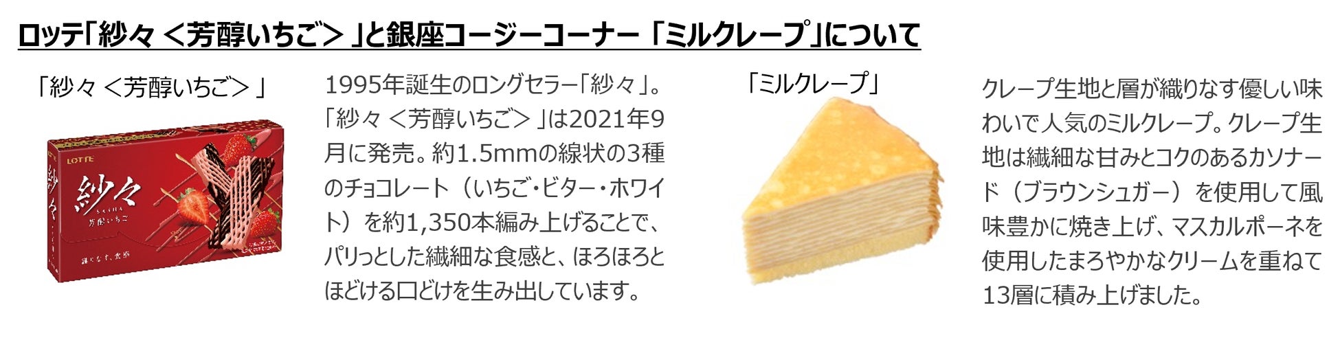 株式会社ロッテ(代表取締役社長執行役員 牛膓 栄一)と株式会社銀座コージーコーナー(代表取締役社長 船田知秀)は、ロッテ「紗々<芳醇いちご>」と銀座コージーコーナー「ミルクレープ」のコラボレーションにより「紗々<芳醇いちご>ミルクレープ」を共同開発しました。2月22日(水)〜4月13日(木)頃の期間、銀座コージーコーナーの全国の生ケーキ取扱店(※)で販売します。※北海道・九州地方及び、福井県・京都府・滋賀県・鳥取県・島根県・山口県・愛媛県・高知県に生ケーキ取扱店はありません。