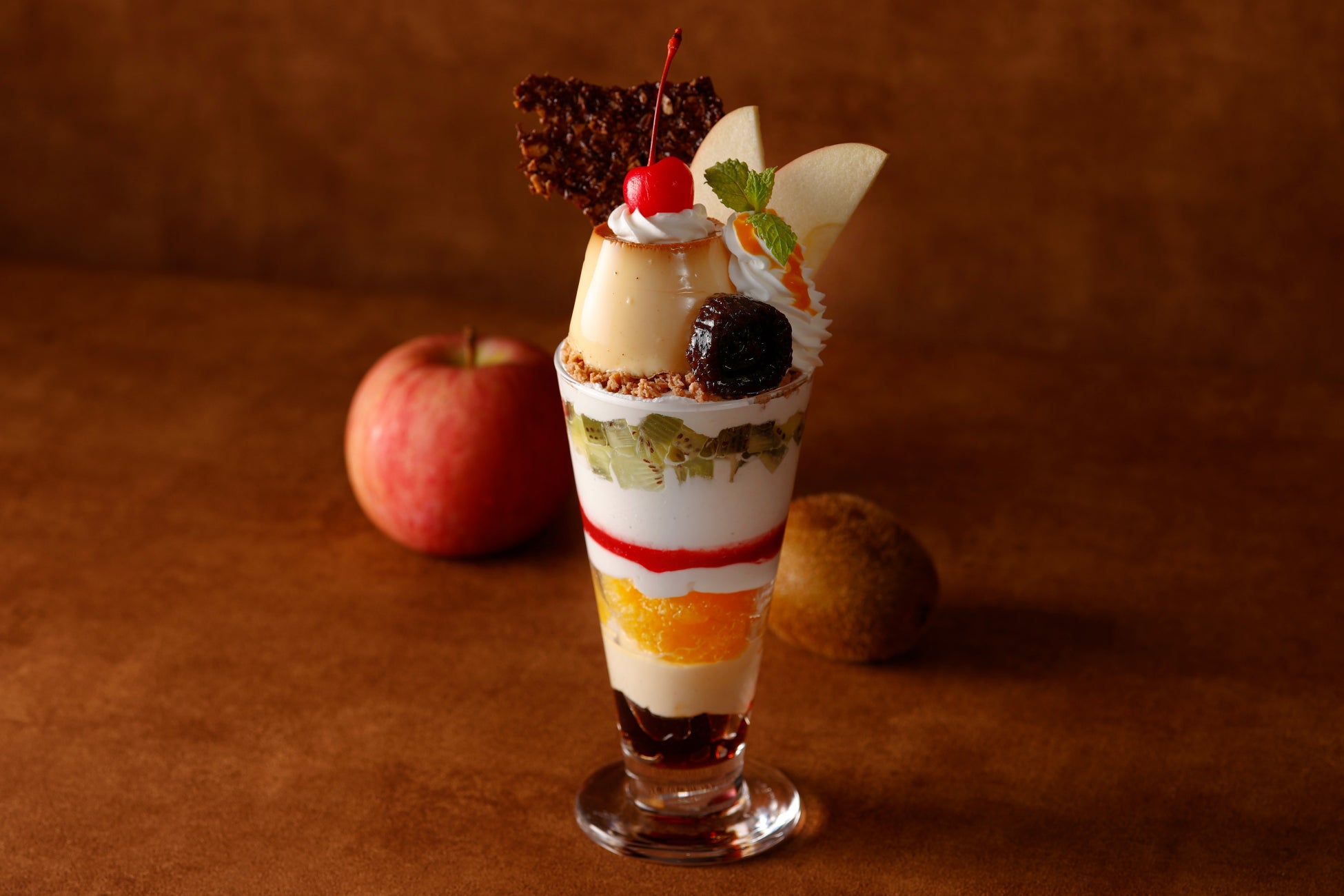 戦後の接収時代に、滞在をしていたアメリカ人将校夫人に喜んでもらいたいという想いで創作した「プリン・ア・ラ・モード」は、当ホテル発祥のデザートです。パフェスタイルにアレンジした「プリン・ア・ラ・モード パフェ」は、2022年より毎年期間限定で販売をしており、今年もお客様からの再販の要望を受け、より美しく贅沢にアレンジして提供します。「プリン・ア・ラ・モード」の彩りある華やかなビジュアルを活かし、トップには伝統のプリンを主役に、リンゴやプルーン、生クリーム、さくらんぼをトッピング、グラスには自家製のバニラアイスや色鮮やかなフルーツを重ね、ヨーグルトムースで層を作り、一匙ごとに多彩な美味しさに出会えるパフェに仕上げました。グラスの最後になめらかなカスタードクリームとほろ苦いカラメルを入れることで最後の一口まで“プリン”を味わうことができます。昭和生まれのデザート「プリン・ア・ラ・モード」の魅力を、令和のアレンジでお楽しみいただける限定のパフェを、この機会にぜひお召し上がりください。