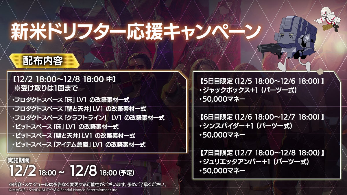 株式会社バンダイナムコエンターテインメントは、PlayStation®5/Xbox Series X|S/STEAM®『SYNDUALITY Echo of Ada』に関して、本日12月2日(火)より、新規プレーヤーのスタートダッシュをサポートするログインキャンペーンである「新米ドリフター応援キャンペーン」を開始いたしました。