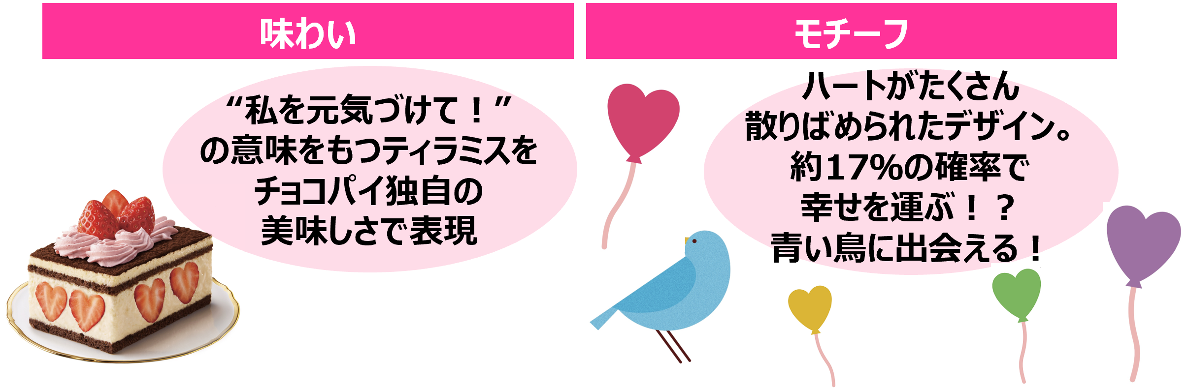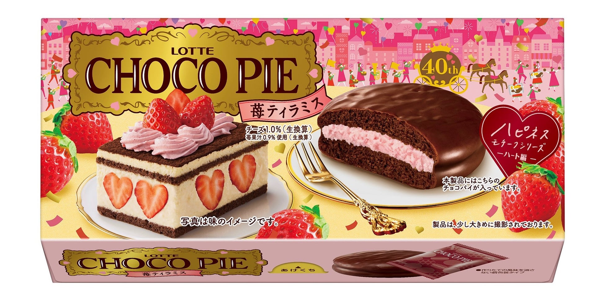 株式会社ロッテは2月28日(火)に、元気な気持ちになれる色やケーキをモチーフにした、チョコパイブランドの新シリーズ「ハピネスモチーフチョコパイ」から、「チョコパイ<苺ティラミス>」を発売します。このシリーズはチョコパイ40周年企画の第1弾として、お客様に“まぁるい幸せ”をお届けしたいという想いから誕生しました。幸せを運ぶ!?青い鳥が約17%の確率でパッケージに出現したり、ハートが散りばめられたデザインで、ハッピーを演出しています。