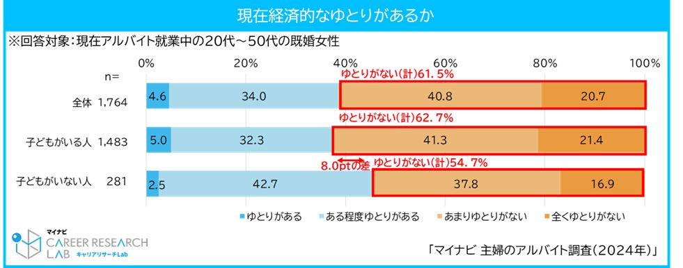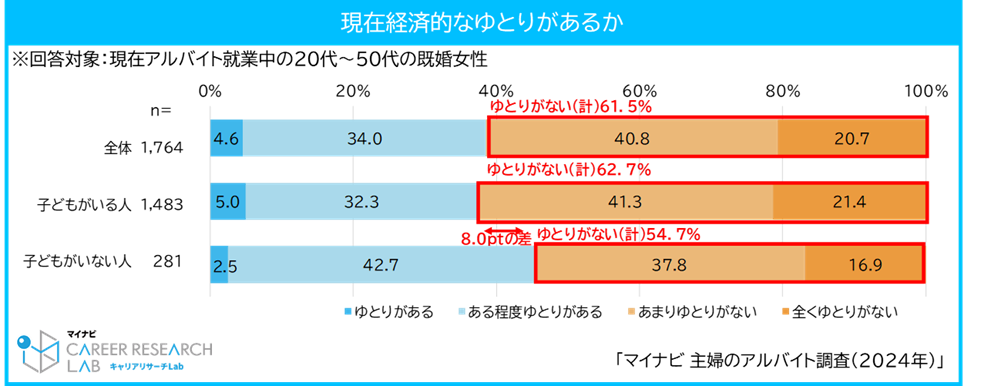 アルバイト・パートで働く主婦で、経済的なゆとりがない割合は61.5%。子どもがいる人の方が8.0pt高い結果に【図1、2】