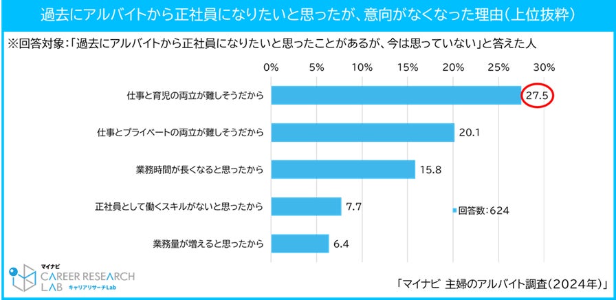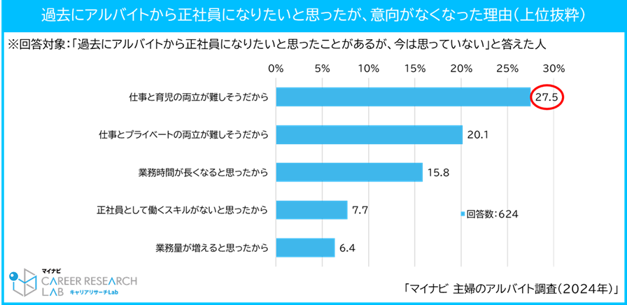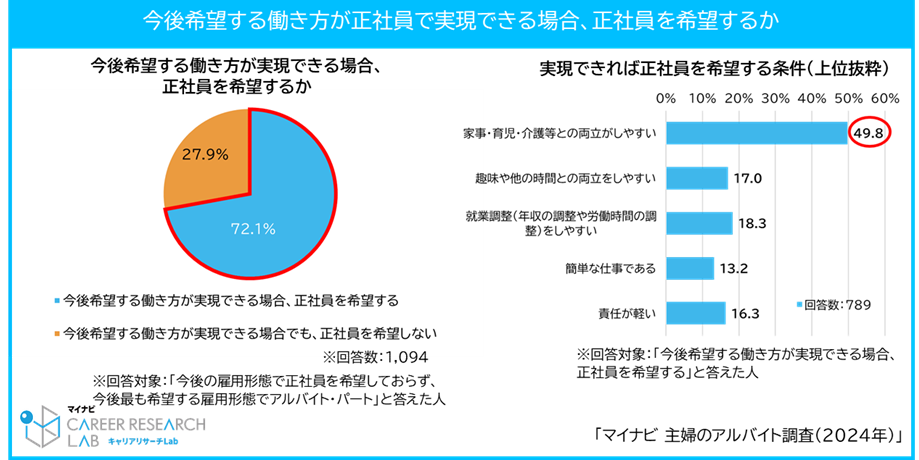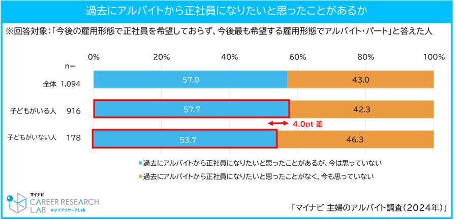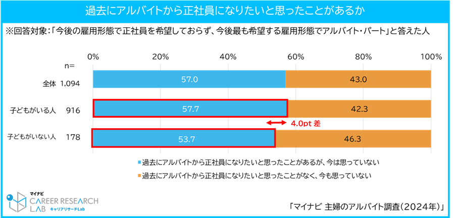 また、アルバイトを希望する主婦で過去に正社員意向があったが、途中で意向がなくなった人は約6割で、子どもがいる人に多く、育児の忙しさが正社員転換の壁になっていることが明らかになりました。