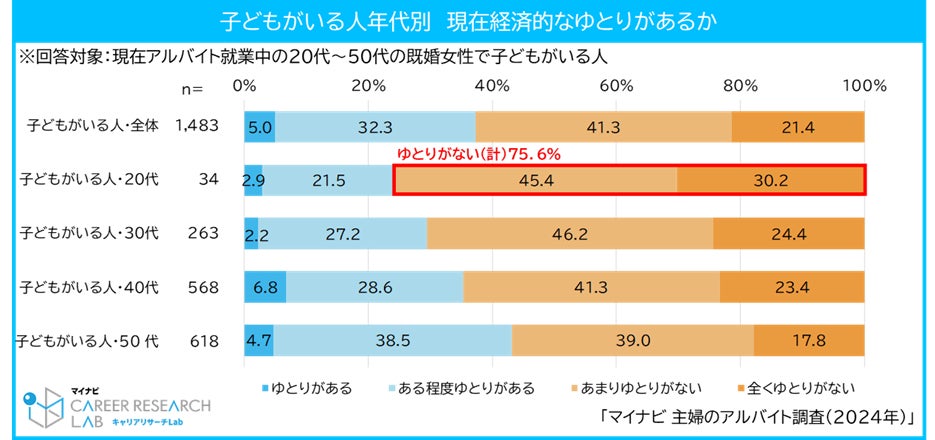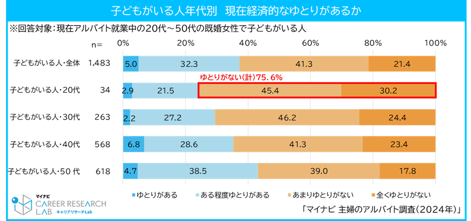 アルバイト・パートで働く主婦で経済的なゆとりがない割合は61.5%と半数を超えた。子どもの有無別では「子どもがいる人」で62.7%、「子どもがいない人」で54.7%となり、子どもがいる人がいない人に比べ8.0pt高くなった。子どもがいる主婦を年代別でみると、ゆとりがない割合は20代が75.6%と最も高く、年代があがるほどゆとりがあることがわかる。【図1、2】