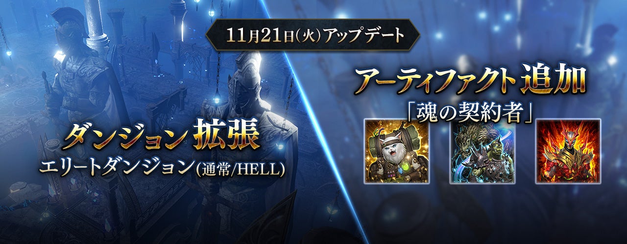 本アップデートでは、新アーティファクト「魂の契約者」を追加した他、エリートダンジョンに新規ダンジョン「ジッグラトの城砦」、エリートダンジョン(HELL)に高難易度な5つの新規ダンジョンが登場しております。