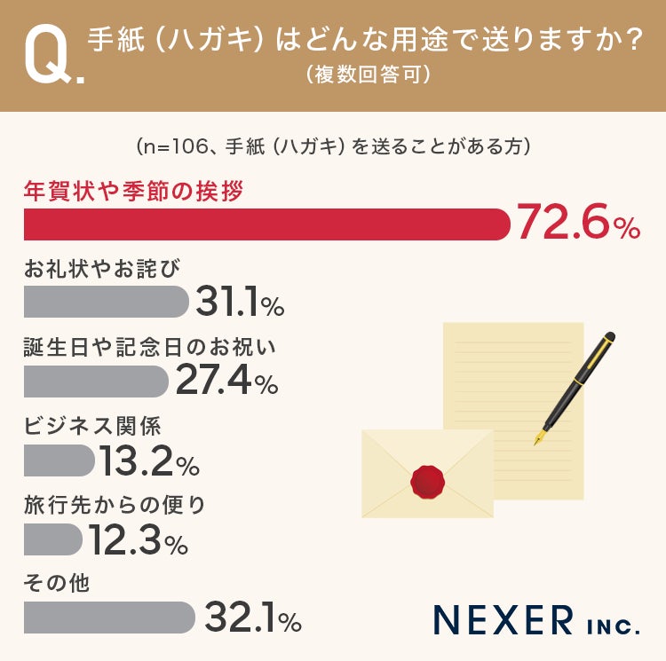 また、「お礼状やお詫び」が31.1%、「誕生日や記念日のお祝い」が27.4%と上位にランクインしています。