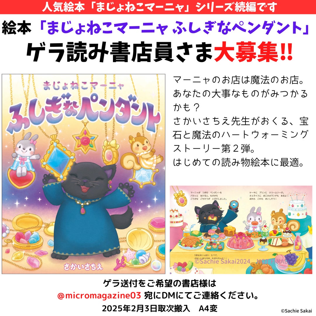 マイクロマガジン社(東京都中央区)は、2025年2月刊行予定の新作絵本『まじょねこマーニャ ふしぎなペンダント』のゲラ(校了前の原稿)を読んでくださる書店員さまを募集いたします。