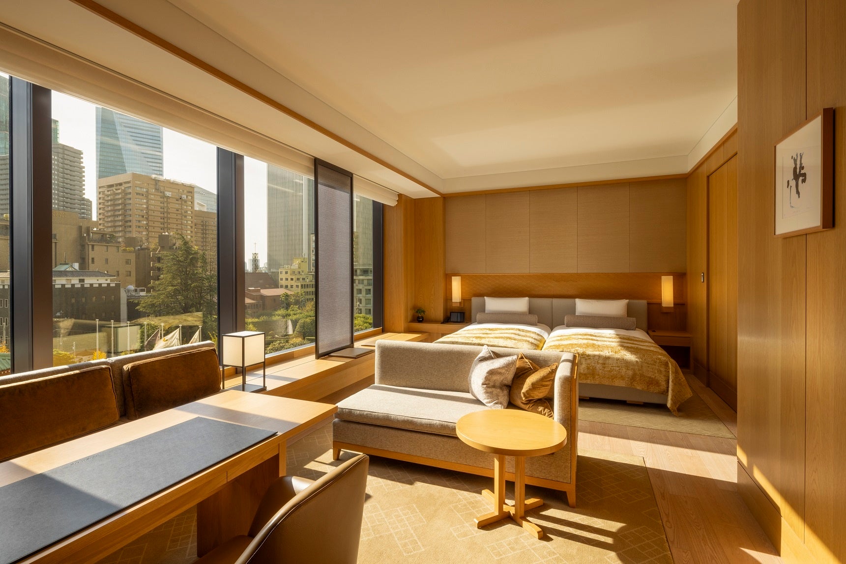 28階以上に配置された約50㎡の客室は、快適さと国際様式の中に和の趣が程よく溶け込んでおり、窓は大きく開放感あふれる空間が特徴的です。自然光がよく入り、部屋全体が明るく、快適な時間をお過ごしいただけます。東京の“今”を一望する空間で、快適なひとときをお過ごしいただけます。