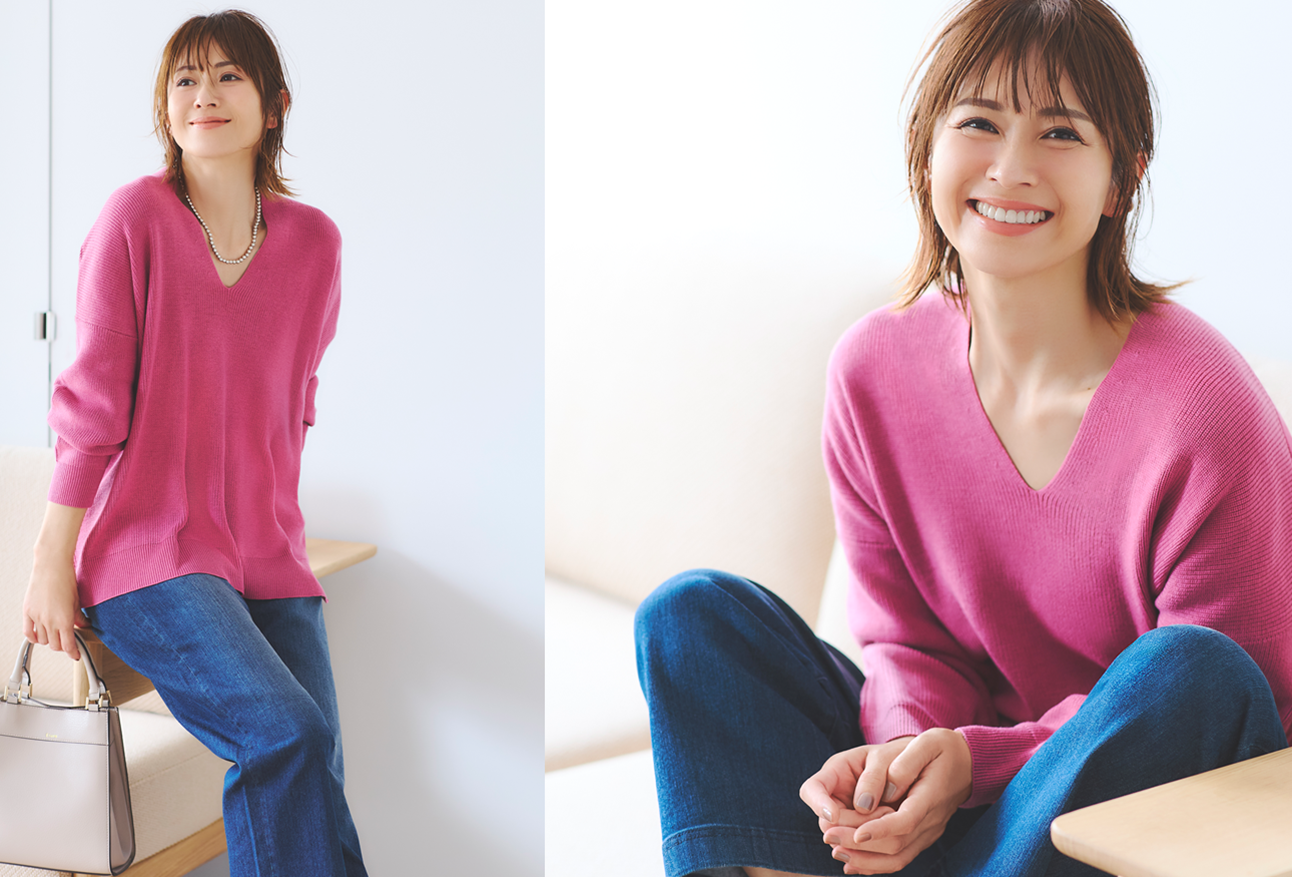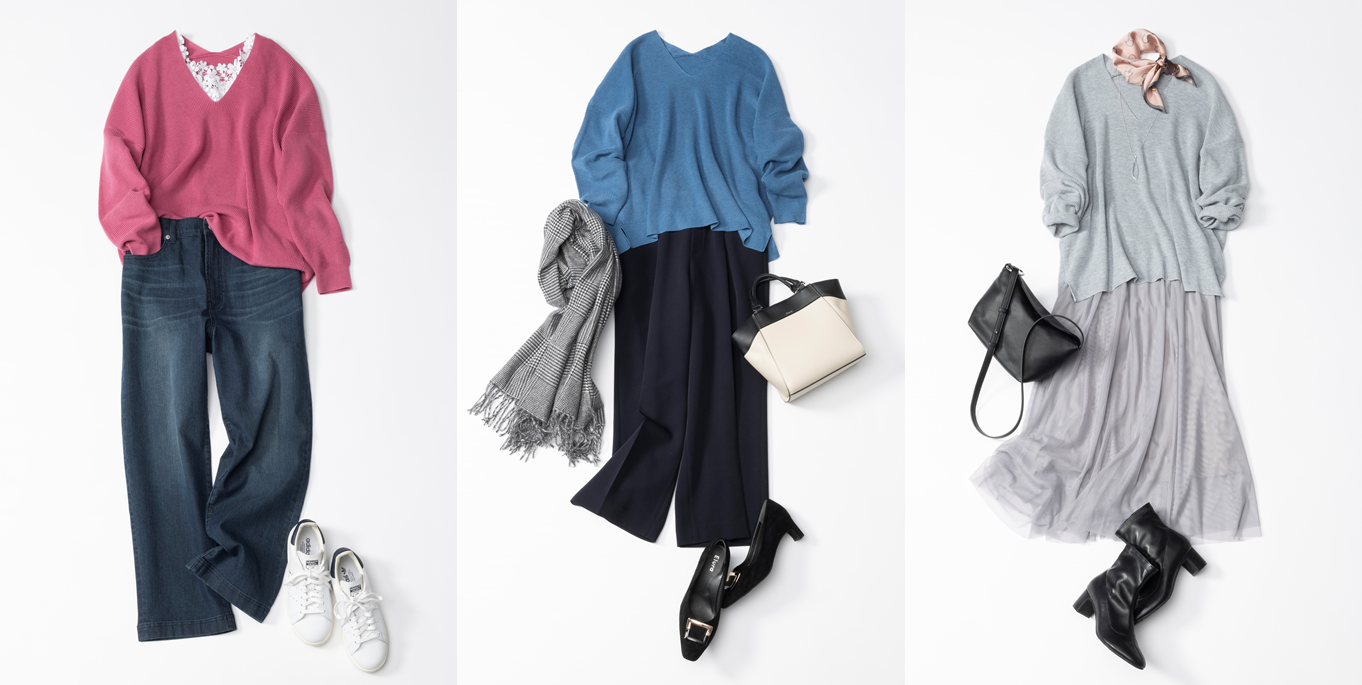 これまで複数シーズンにわたり展開してきた<抜け感Vネックニット>。その人気の秘密は、大人女性の体型やお悩みを考え抜いて、毎回改良を重ねたどり着いたこだわりのシルエットにあります。