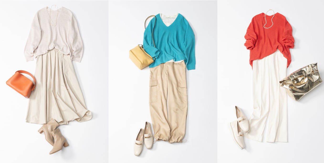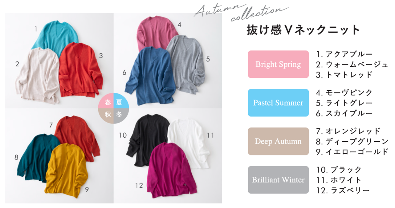 Eluraで毎シーズン完売の大人気ニット「抜け感Vネックニット」のカラー展開を、日本カラリスト協会が監修。ブライトスプリング・パステルサマー・ディープオータム・ブリリアントウィンターの4つのパーソナルカラーに寄り添った全12色展開で発売します。また、各カラーに対応し、今シーズンEluraで展開するレギュラー商品をふんだんに用いた全身コーディネートも、パーソナルカラーの理論に基づき同協会監修のもとそれぞれ提案しています。