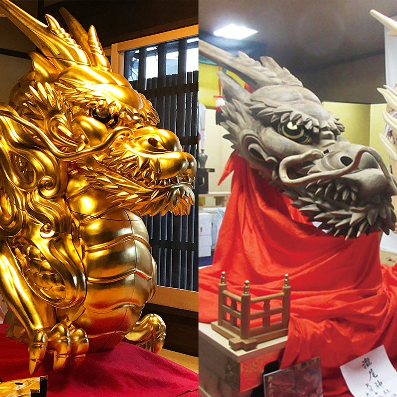 金箔を施された大船鉾の船首を飾る龍頭(写真左)。その復元時にモデルにされた瀧尾神社の龍頭も特別に展示します(写真右)。