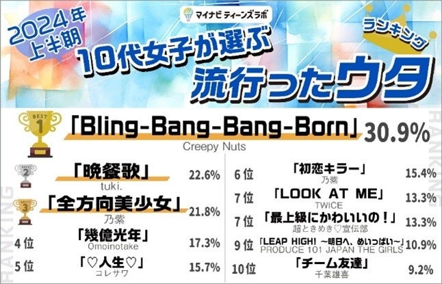 本ランキングは、2024年上半期に流行した「ヒト・コト・モノ・コトバ・ウタ」の5ジャンルについて、13〜19歳の女性682名にアンケート回答を集計したものです。