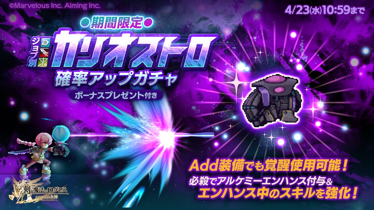 株式会社マーベラス(代表取締役社長:照井 慎一/所在地:東京都品川区)は、スマートフォン向け本格オンラインRPG『剣と魔法のログレス いにしえの女神』において、2025/4/16(水)に新武器を追加した「ジョブ別 ソルディオス確率アップガチャ」の販売、および「シナリオメモリアル シークレットガーデン~奪われた体と忘れられた人形~」の開催などを含むアップデートを行ったことをお知らせいたします。