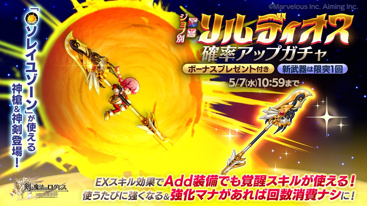 スマホ向け本格オンラインRPG『剣と魔法のログレス いにしえの女神』<魔晶石100個は4/23(水)まで!「ソルディオス」に神槍&神剣登場!>