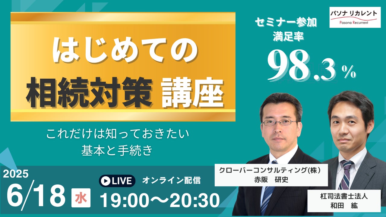 株式会社パソナマスターズが運営する、個人のキャリア・ライフプランに合った学びの場を提供する教育プラットフォームサービス「パソナリカレント」では、セミナー参加満足率98.3%を誇るウェビナー、「はじめての相続対策講座~これだけは知っておきたい基本と手続き~」を、6月18日(水)に開催いたします。