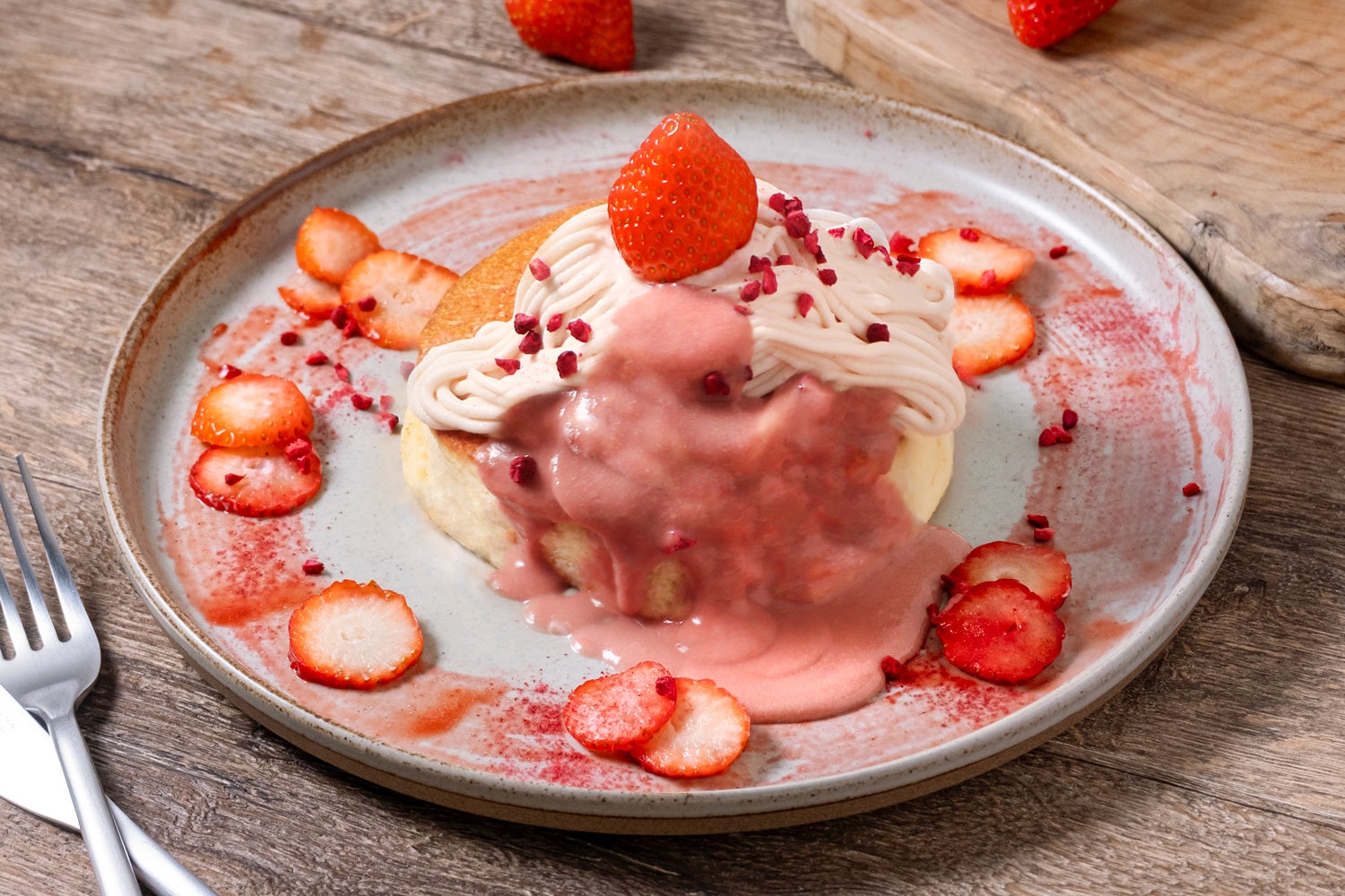 焼きたてのパンケーキの上にはストロベリーアイスと、爽やかで甘酸っぱいいちご風味のチーズクリームをたっぷりモンブラン仕立てに。ホワイトチョコにストロベリーを合わせた甘くミルキーなソースを添えて、さらにいちごを散らした、いちごづくしのパンケーキ。