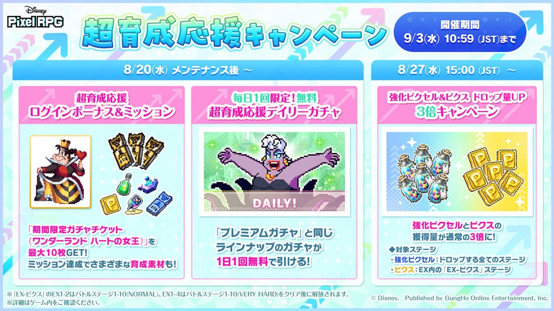 「超育成応援キャンペーン」では、期間中累計7日間のログインで、新キャラクター「ワンダーランド ハートの女王」の期間限定ガチャチケットが10枚獲得できる「超育成応援ログインボーナス」や、クリアすることで「プレミアムガチャチケット」やキャラクターの育成素材がゲットできる「超育成応援ミッション」など、各種イベントを開催いたします。