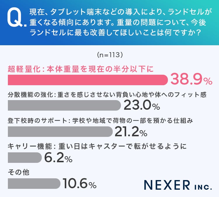さらに「分散機能の強化」が23%、「登下校時のサポート」が21.2%と続き、物理的な軽量化と重さを感じさせない工夫の双方が重要視されていることが分かります。