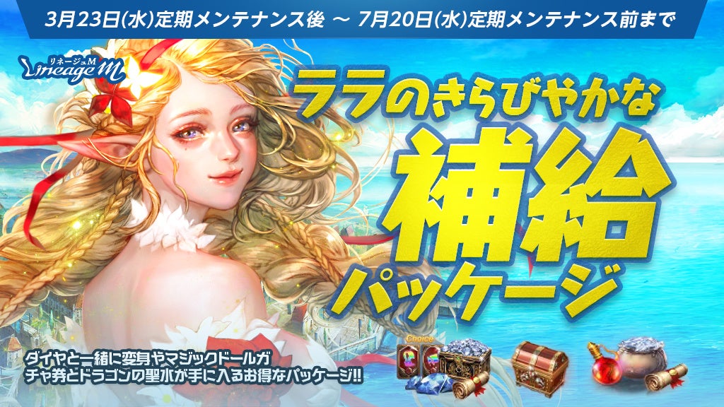 本パッケージは「ララのきらびやかな補給パッケージ」「ララのきらびやかな補給パッケージ(ドラゴンの聖水)」「ララのきらびやかな補給パッケージ(カードガチャ券選択箱)」の3種類があり、各種パッケージに付属する「ララのきらびやかな証書」は英雄級装備の「デスナイトの防具選択箱」「カーツの防具選択箱」や各種「祝福された魔王の武器」などの貴重なアイテム製作にチャレンジすることが可能です。