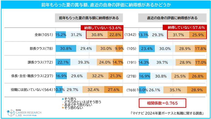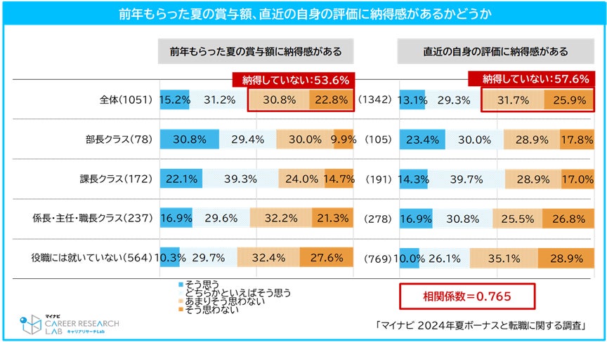 前年夏の賞与額に納得していない人は半数以上。「賞与」への納得感が低い人は、「評価」への納得感も低い傾向【図5】