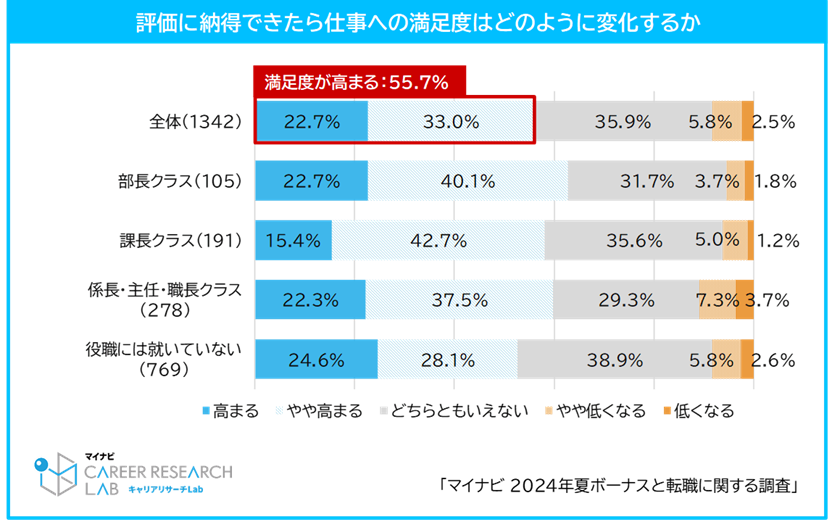 評価に納得ができた場合、仕事への満足度はどう変化するか聞いたところ、「満足度は高まる」と答えた人は55.7%(「高まる(22.7%)」+「やや高まる(33.0%)」)だった。賞与と評価の納得感には相関が見られているため、双方の納得感が得られることで、仕事に満足感を持って働く人が増えると考えられる。【図6、7】
