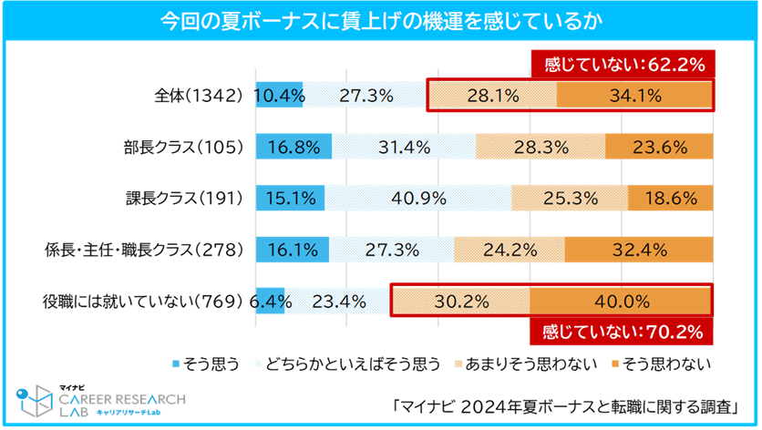 また、今年の夏ボーナスに「賃上げの機運を感じているか」を聞いたところ、「そう思わない(34.1%)」が最も多かった。「あまりそう思わない(28.1%)」と合計すると、62.2%が「今回の夏ボーナスに賃上げの機運は感じていない」と回答している。役職別に見ると、夏ボーナスに賃上げの機運を感じていないという回答が特に多かったのは「役職には就いていない」人で70.2%だった。【図3、4】
