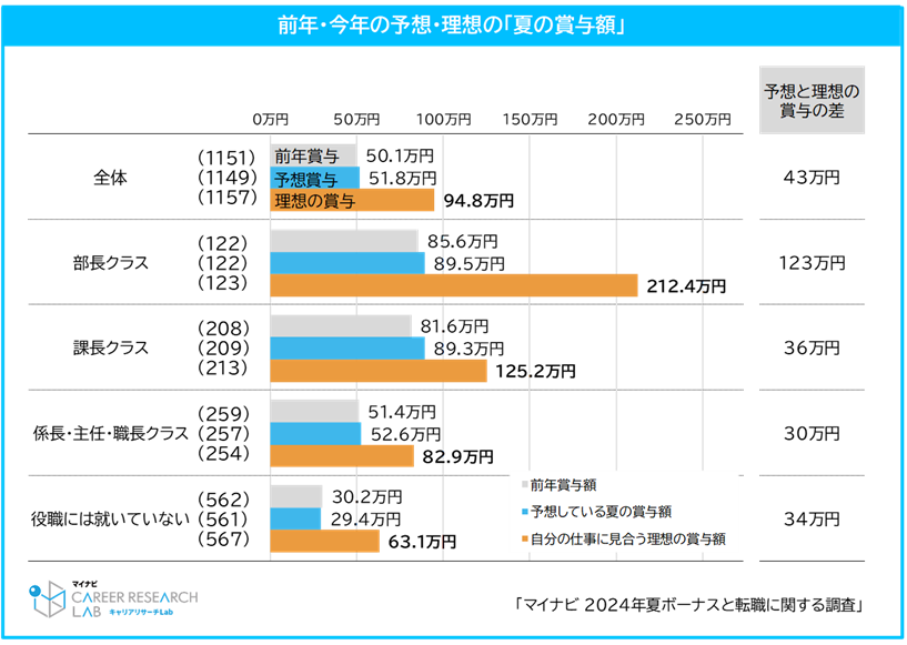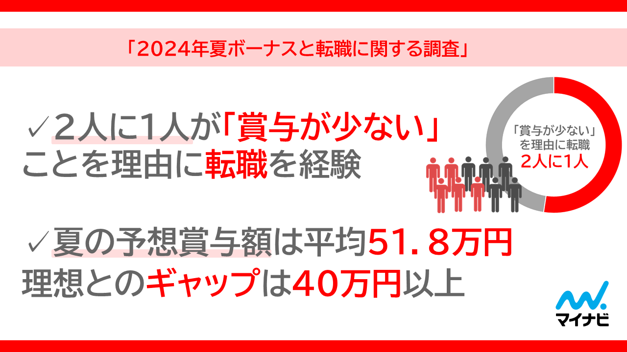 約2人に1人が、「賞与が少ない」ことが理由で転職を経験。夏の予想賞与額は平均51.8万円で理想とのギャップは40万円以上。6割以上の人が「夏ボーナスに賃上げの機運を感じていない」