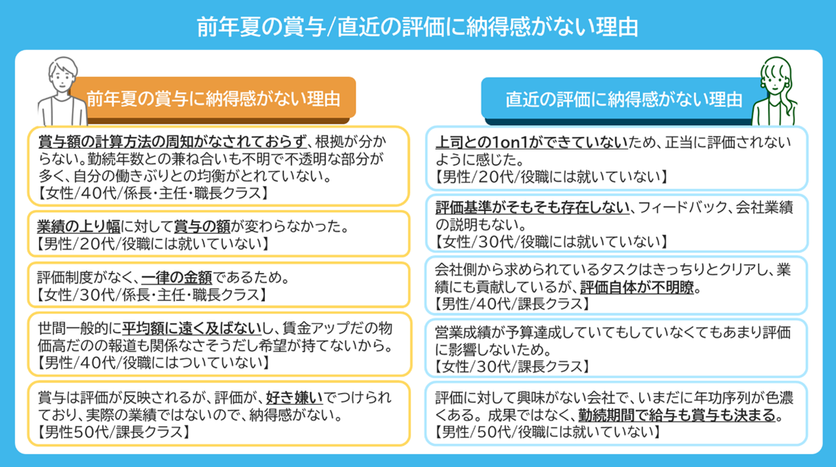 また、評価への納得感がない理由としては、「上司との1on1ができていない」「評価基準がそもそも存在しない・不明瞭」など、フィードバックの有無や評価基準の不明瞭さ、「勤務期間で賞与が決まる」といった年功序列制への不満があげられた。