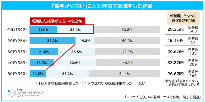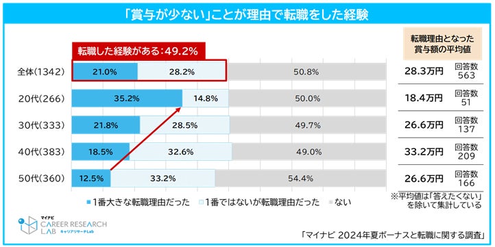 賞与が少ないことを理由に転職をしたことがある人は49.2%(「1番大きな転職理由だった」21.0%+「1番ではないが転職理由だった」28.2%)となり、転職理由となった賞与の平均額は28.3万円だった。年代別では20代において、「1番大きな転職理由だった」の割合が35.2%と最も高く、若年層ほど賞与額の少なさが転職の理由になっていることがわかる。