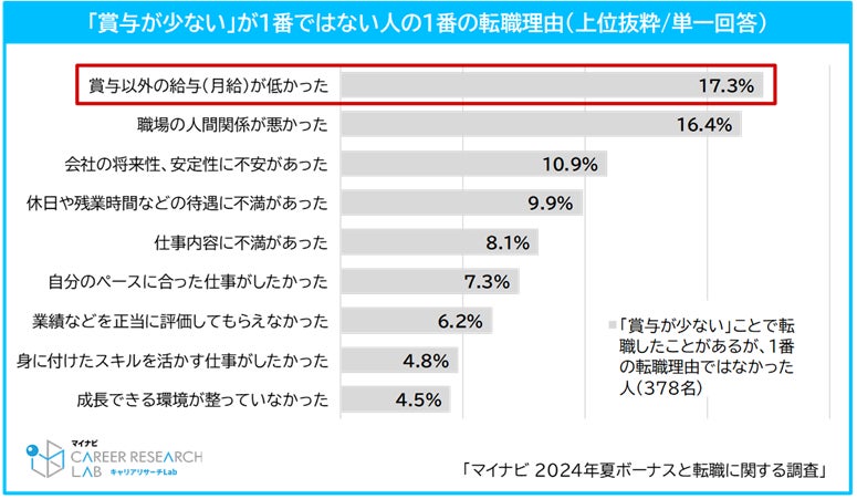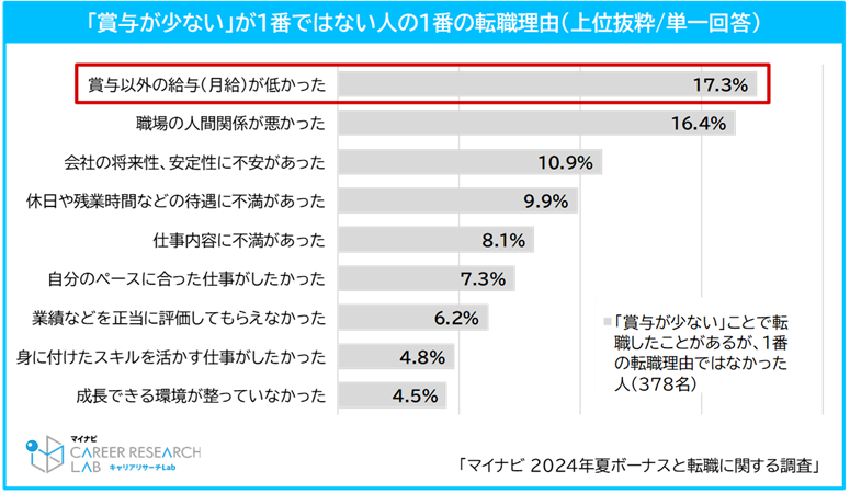 また、「1番ではないが転職理由だった」と回答した人に1番の転職理由を聞いたところ、最も多かったのは「賞与以外の給与(月給)が低かった(17.3%)」だった。賞与に限らず金銭的な点が転職理由で多いようだ。【図1、2】