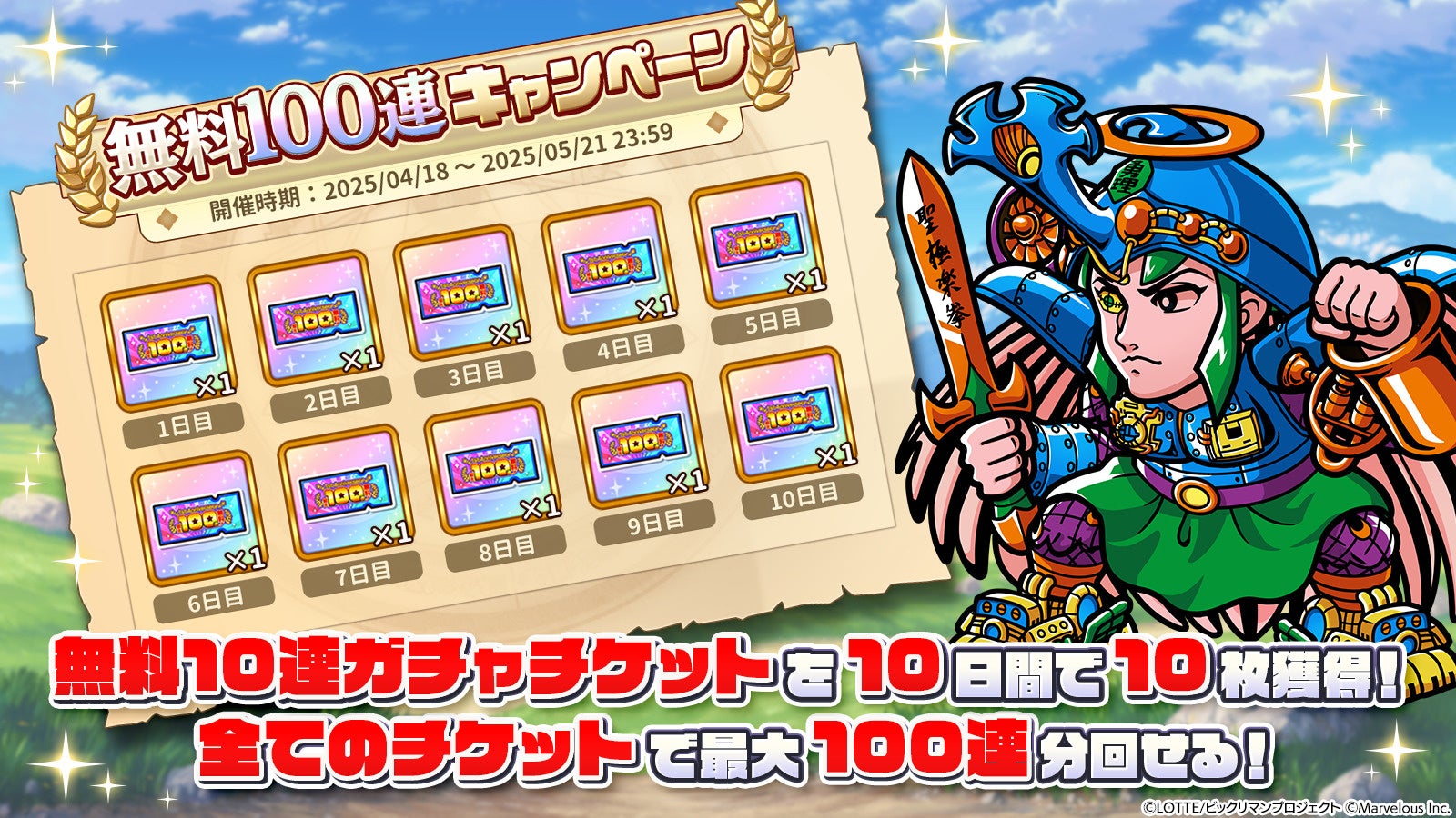 ログインした際に「最大100連無料!毎日無料10連ガチャチケット」を1枚、10日間で10枚獲得できるキャンペーンを開始いたしました。