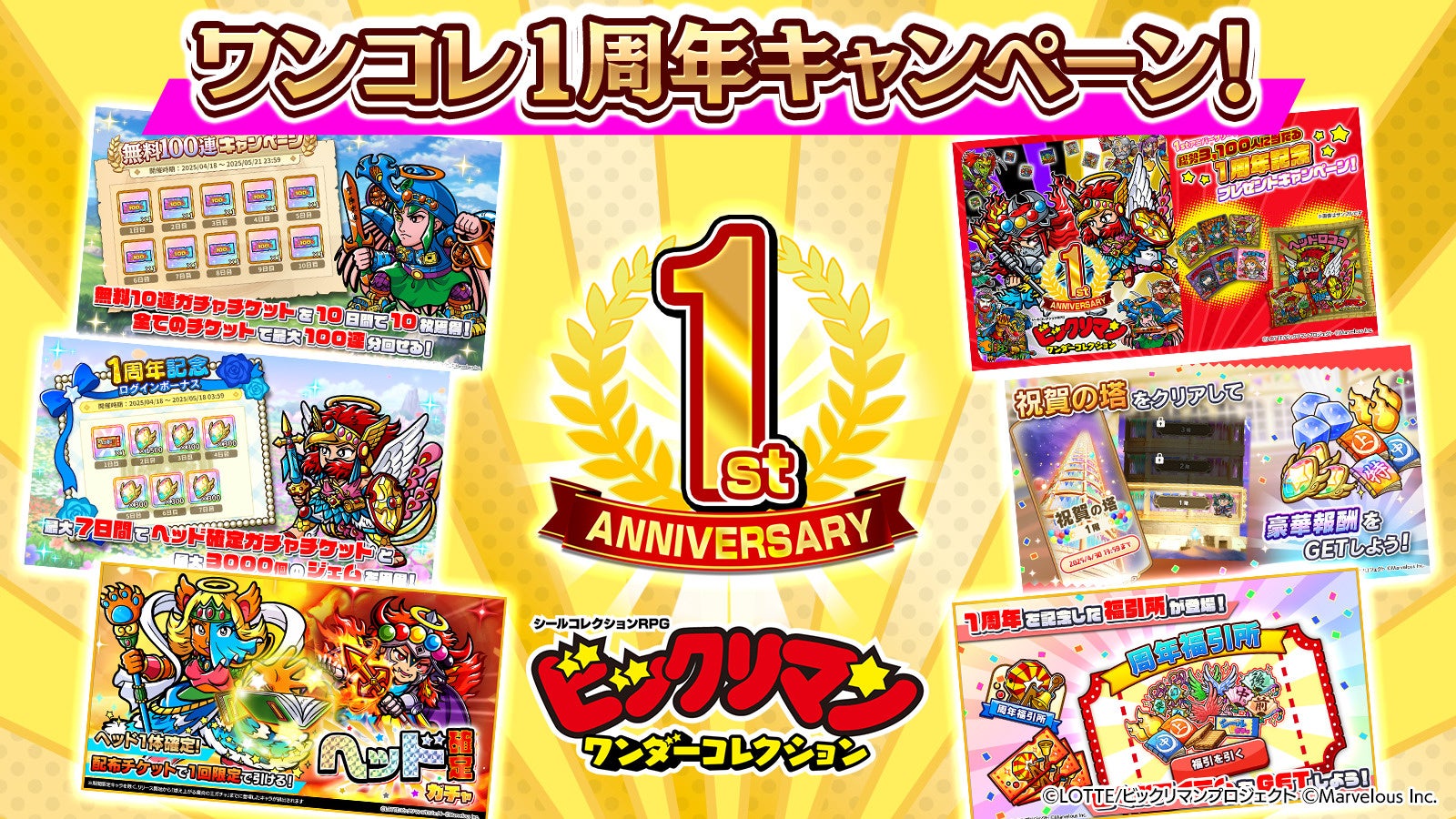 株式会社マーベラス(代表取締役社長:照井 慎一/所在地:東京都品川区)は、シールコレクションRPG『ビックリマン・ワンダーコレクション』にて無料100連キャンペーンや「ヘッド確定ガチャチケット」がもらえるログインボーナス等を含む「ワンコレ1周年キャンペーン」が2025年4月18日に追加されたことをお知らせいたします。また併せてメインストーリー「聖魔大戦編第17章 起死回生の光輝」、「ヘッドロココ誕生とブラック祖暗躍ガチャ」、ダメージチャレンジイベント「極大暴走 魔限界突破・ネロ魔身」、期間限定コンテンツ「大乱戦 サタンマリア」、期間限定「祝賀の塔」等を開始いたしました。また、「ビックリマンの日記念 ワンコレ総選挙」の結果発表をお知らせいたします。