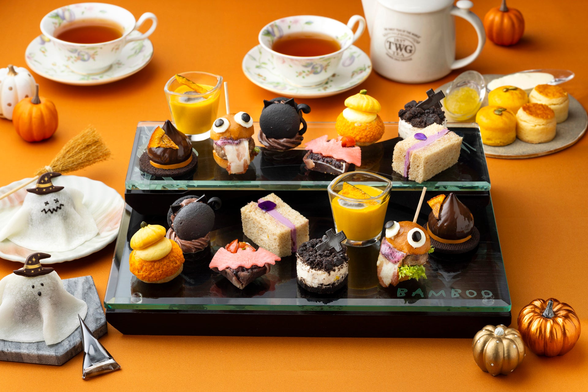 お客様自身で顔を描いて仕上げる「おばけ大福」をはじめ、「魔女帽子オレンジキャラメルのムースショコラ」や「黒猫のマカロンショコラ」など遊び心あふれるスイーツと、秋の味覚を生かしたセイボリー、2種のスコーンを取り合わせ、目でも味わいでもハロウィーン気分を楽しめるポップでキュートなアフタヌーンティーに仕上げました。ロビーラウンジ バンブーで、ハロウィーンならではのワクワクするひとときをお過ごしください。