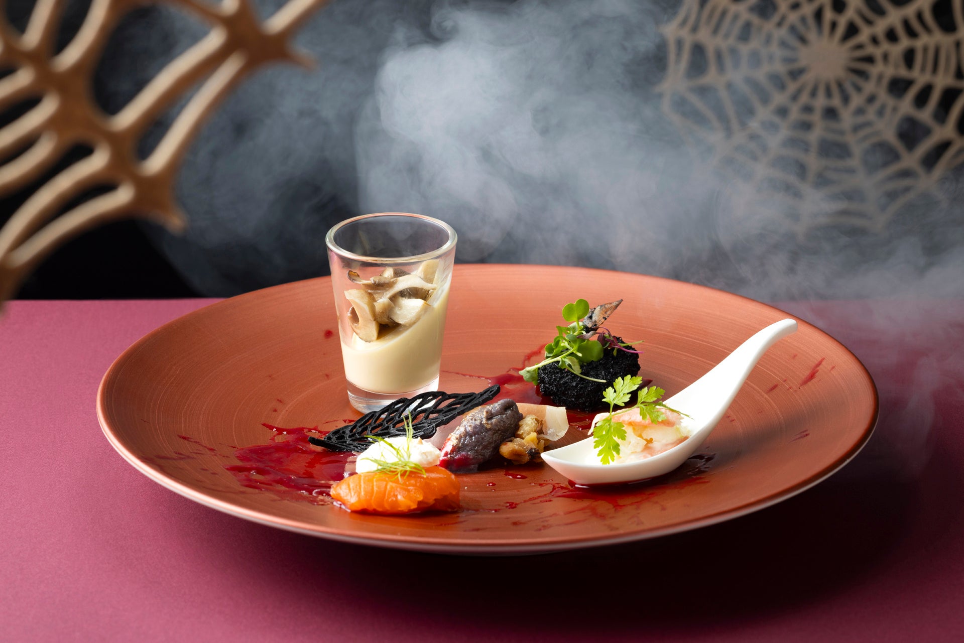 全5品のコースは紫芋やカボチャといった秋の食材をハロウィーン仕立てに。コースの締めには、火の玉をイメージしたデザートをご用意。遊び心あふれるハロウィーンを演出します。