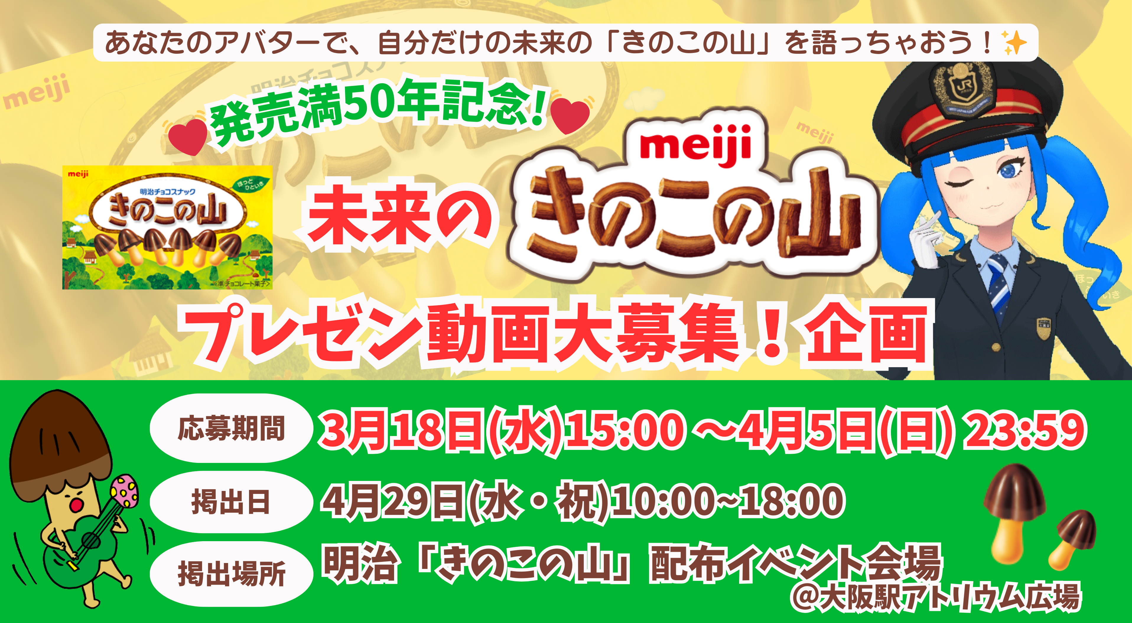 2025年に 発売から満50年を迎えた「きのこの山」のこれからの未来をテーマに、ユーザーによるプレゼン動画を募集いたしました。夢のある自由な発想で、「未来の明治『きのこの山』」を語っていただく企画です。どんな商品だったら楽しい?うれしい?食べてみたい?と想像を膨らませ、バーチャルユーザーならではの発想力やアイデアを活かした個性的なプレゼン動画を多数投稿いただきました。その中でも選ばれた作品は、2026年4月29日(水・祝)に大阪駅アトリウム広場で実施のリアルイベントにて放映予定です。
