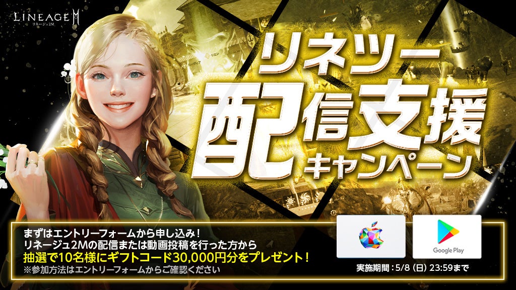 YouTubeで10分以上、『リネージュ2M』のプレイ配信を行うか、動画投稿を行ったプレイヤー(※注1)から抽選で10名の方にギフトコード30,000円分をプレゼントします!