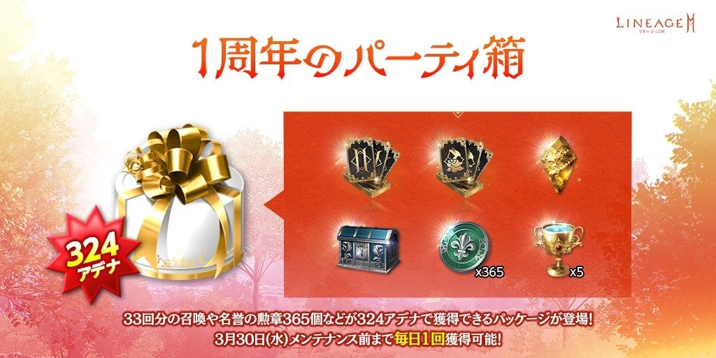 期間中、毎日324アデナで交換できる「1周年のパーティ箱」が登場しました。