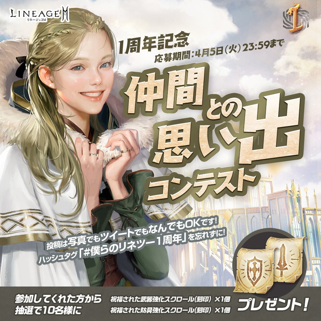 『リネージュ2M』での1年間の思い出をツイートした人の中から抽選で5名の方に、ゲームプレイに役立つアイテムをプレゼントします。