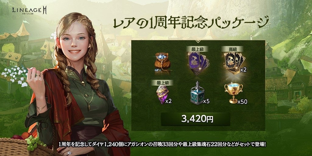 1周年を記念して、ダイヤ1,240個とアガシオン召喚33回分などがセットになった「レアの1周年記念パッケージ」が登場しました。