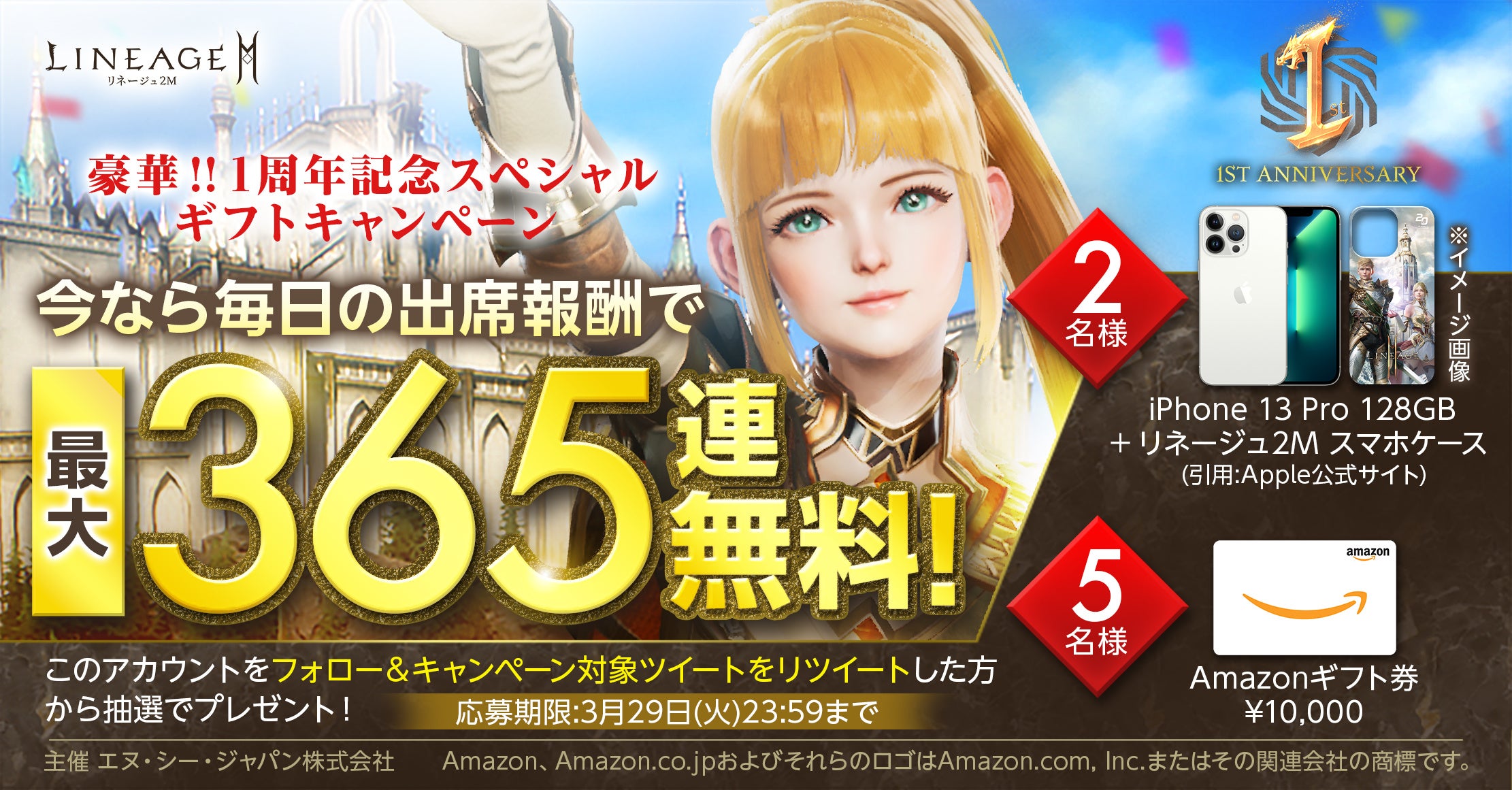 1周年を迎えた『リネージュ2M』から感謝を込めて、iPhone 13 Proとリネージュ2M スマホケースのセットや、Amazonギフトカードを抽選でプレゼントします。