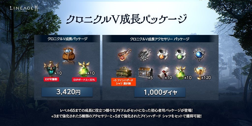 レベル65までの成長に役立つ「クロニクルV成長パッケージ」と「クロニクルV成長アクセサリーパッケージ」が登場しました。
